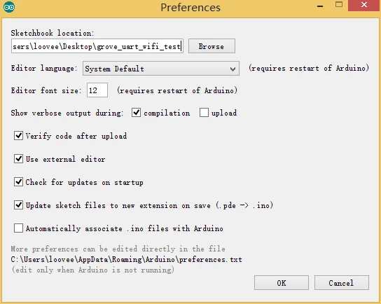 Нажмите OK, чтобы завершить настройки, закрыть и повторно открыть IDE, нажмите файл> Sketchbook, выберите grove_uart_wifi_test, вы можете открыть тестовый код: