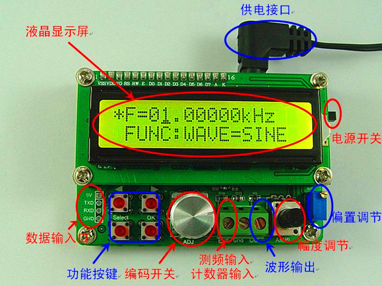 Режим работы: все основные операции, LCD1602 жидкокристаллический дисплей на английском языке, прямой цифровой набор или ручка непрерывной регулировки