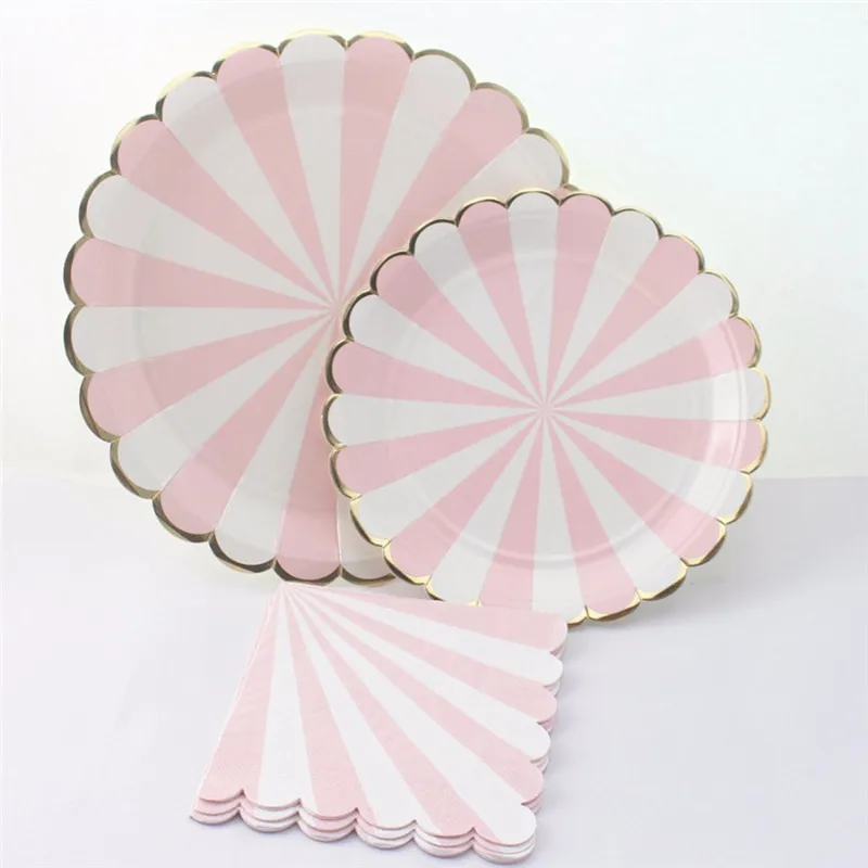 Позолоченный высококачественный одноразовый набор посуды розовые бумажные тарелки в полоску салфетки для стаканчиков вечерние свадебные Карнавальная посуда принадлежности