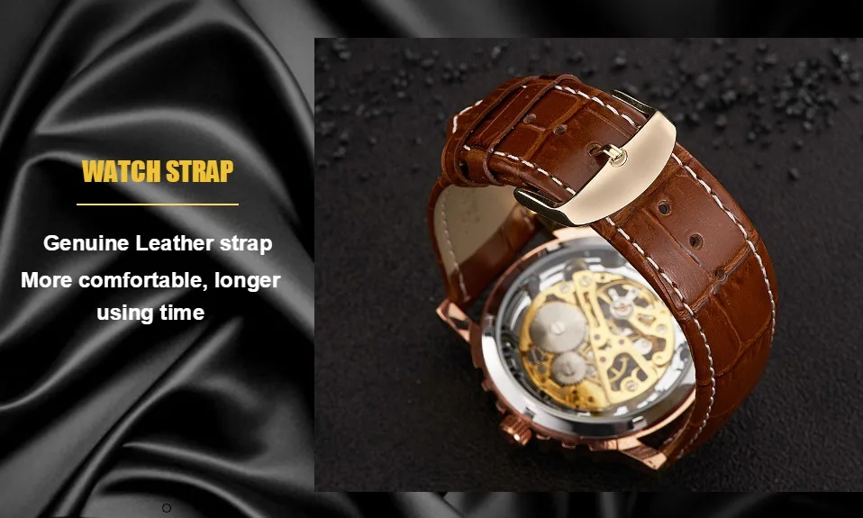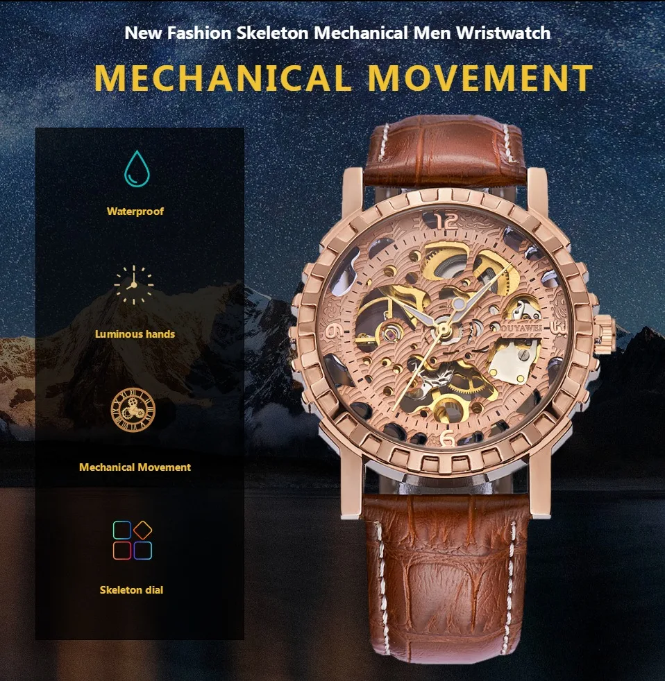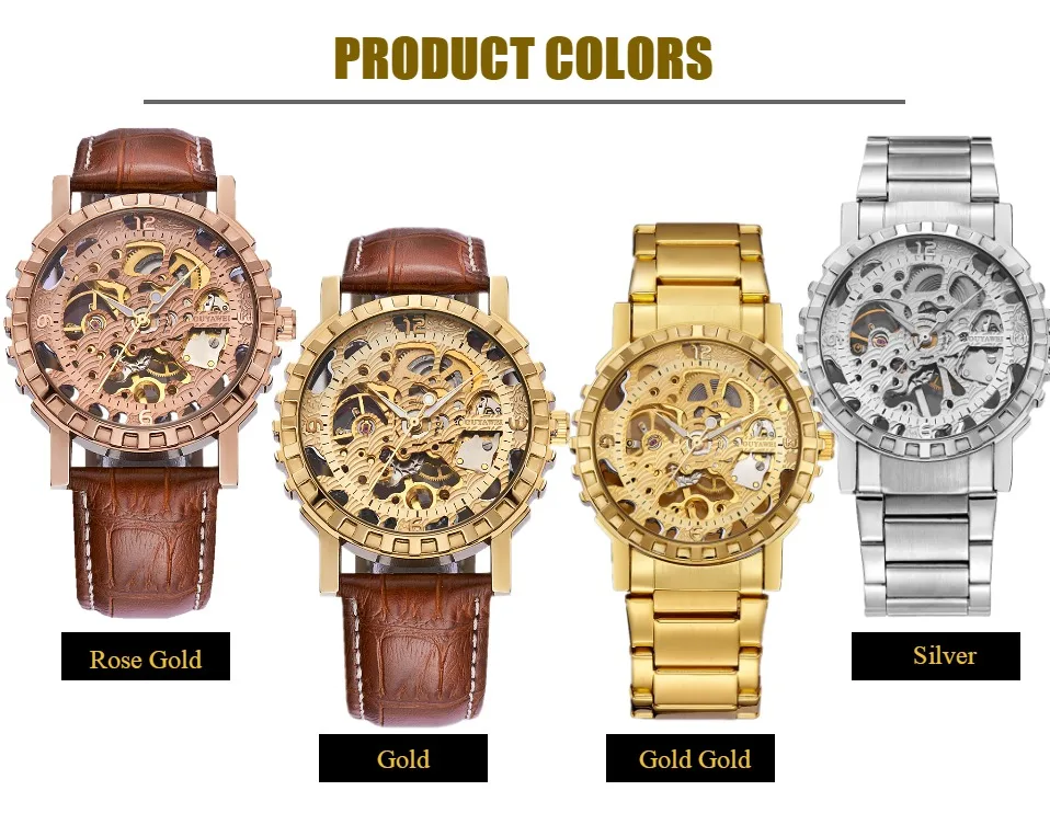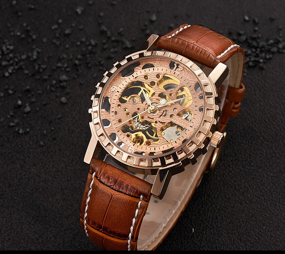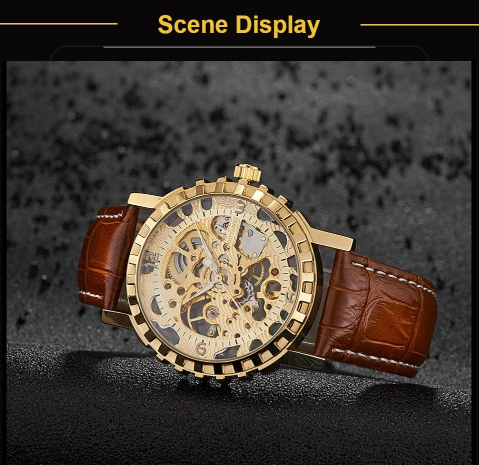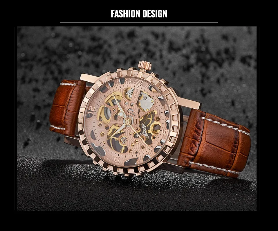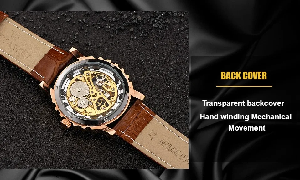 1.100% Абсолютно новый высококачественный 2. Механическое ручное движение ветра, питание от поворота короны, батарея не требуется 3. Браслет из нержавеющей стали/натуральная кожа и сплав круглый чехол для часов. 4. Ежедневная Водонепроницаемость до 3 АТМ. 5. Специальный дизайн скелета 6. Прозрачная задняя крышка, откройте для себя красоту механического движения
