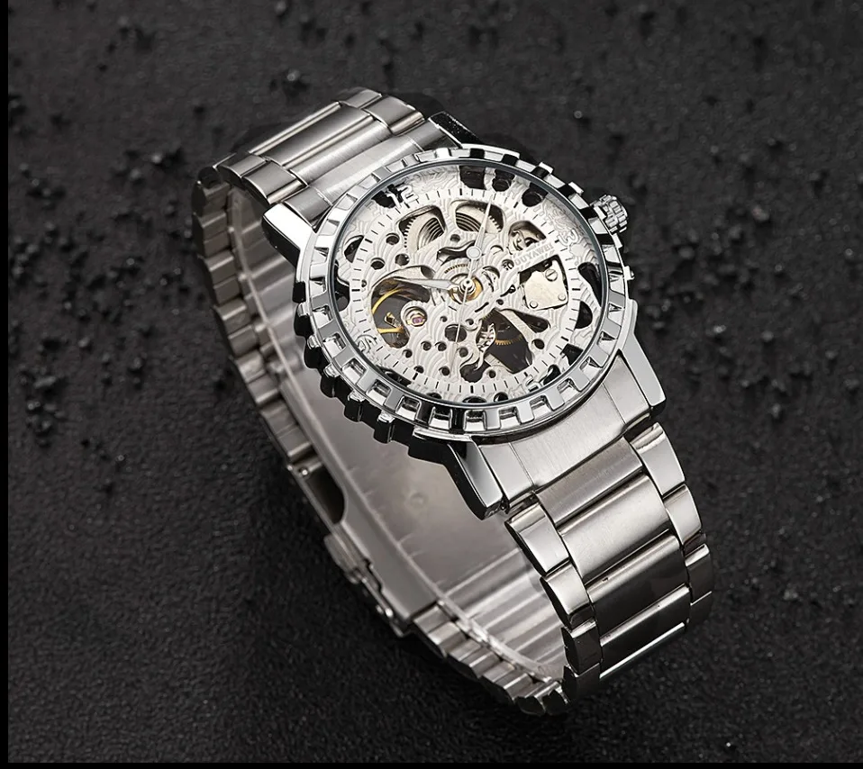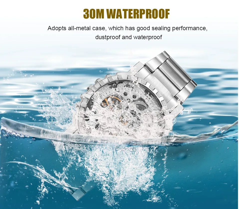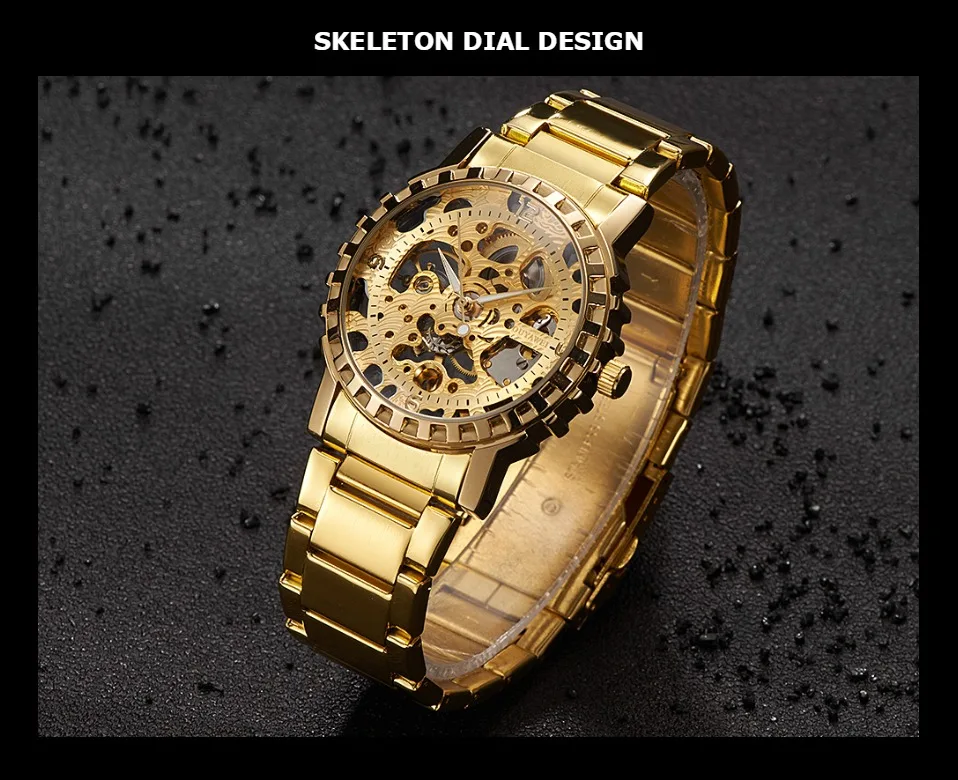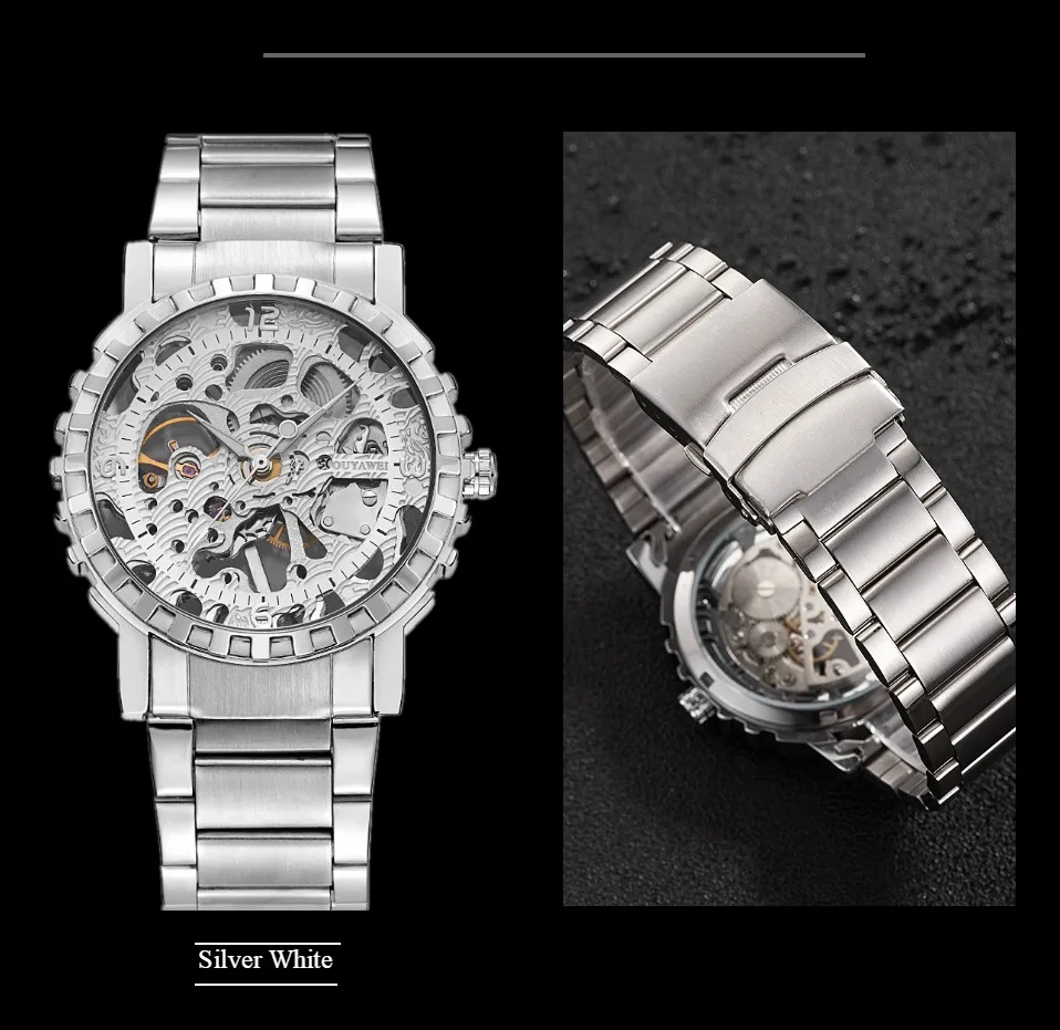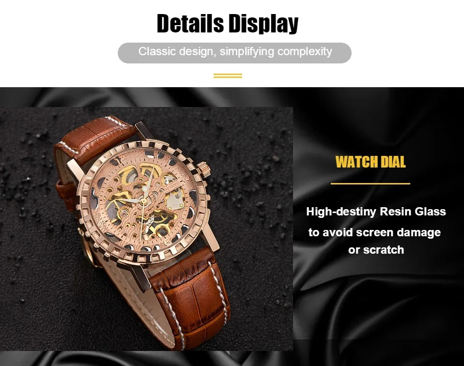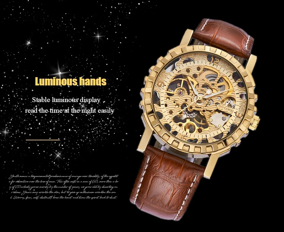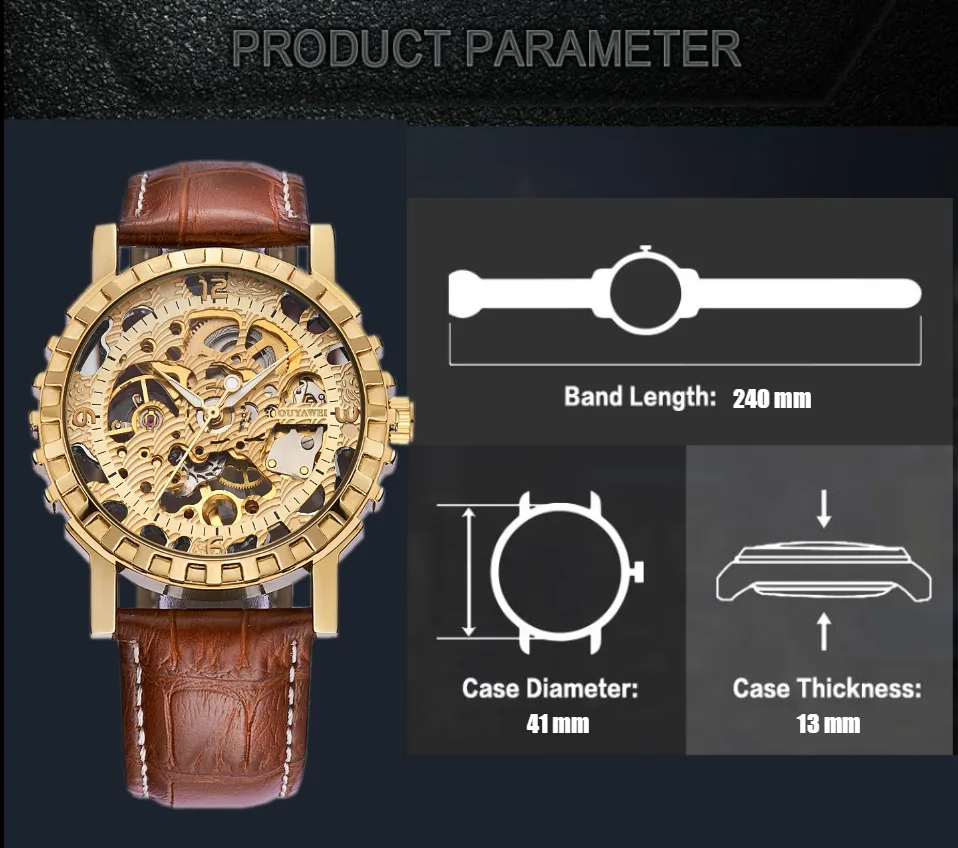 1.100% Абсолютно новый высококачественный 2. Механическое ручное движение ветра, питание от поворота короны, батарея не требуется 3. Браслет из нержавеющей стали/натуральная кожа и сплав круглый чехол для часов. 4. Ежедневная Водонепроницаемость до 3 АТМ. 5. Специальный дизайн скелета 6. Прозрачная задняя крышка, откройте для себя красоту механического движения
