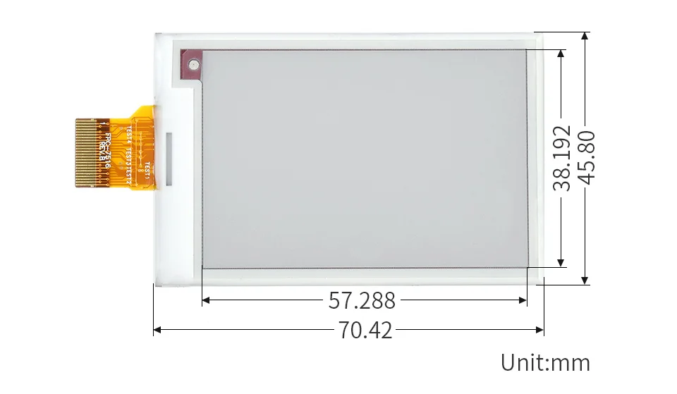Пассивно отражающийОсобенности с первого взглядаНет подсветки, держит отображение последнего содержимого в течение длительного времени даже при отключении питанияУльтра низкое энергопотребление, в основном мощность требуется только для освеженияПоставляется с ресурсами разработки и руководством (примеры для Raspberry Pi/Jetson Nano/Arduino/STM32)Технические характеристикиРабочее напряжение3,3 VЦвет дисплеяКрасный, черный, белыйИнтерфейс3-провод SPI, 4-провод SPIСерые весы2.Габаритные размеры70,42 × 45,8 × 0,98 ммПолное время обновления15sРазмер дисплея57,288 × 38,192 ммОбновленная мощность26,4 МВт (typ.)Точка шаг0,217 × 0,217 ммТок в режиме ожидания<0.01uA (почти нет)Разрешение264 × 176 пикселейУгол обзора> 170 °