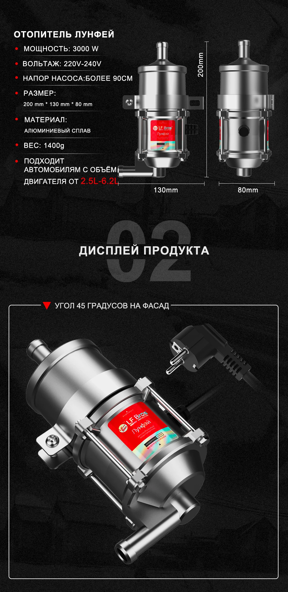 - Подходит для автомобилей с объёмом двигателя от 2.5-6л - Морозостойкий кабель - Двойная защита от перегрева, подогреватель является полностью безопасным; - Встроенный термостат - Время подогрева всего 30 минут; - Циркуляция ОЖ: Встроенный центробежный насос; - Размеры: 182мм*82мм*80.5мм - Материал корпуса: Алюминиевый сплав - Мощность: 3000 Ватт - Напор помпы: 600мм - Производительность помпы 8 л/мин - Вес: 1200 г - Диаметр патрубков: 17 мм Срок службы: не менее 2000 часов