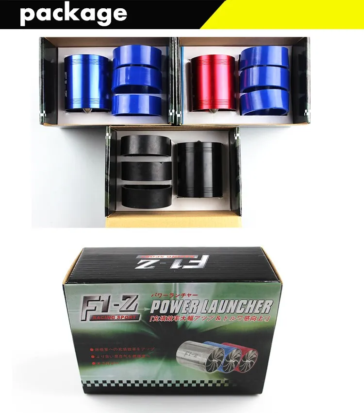 F1-Z/simota двойной турбины турбо Зарядное устройство забора воздуха газа вентилятор для экономии топлива автомобиля супер Зарядное устройство Turbonator вентилятор RS3-TUR007 Функция продукта: Крутящий момент автомобиля при низкой скорости вращения значительно улучшен, а также повышен расход воздуха на воздухозаборник.Для более полного сгорания моторного отсека бензина, дроссельная заслонки ощущается легче и гибче.Также может играть роль в экономии, экономия топлива более 5%-15%, независимо от модели, удобная установка.