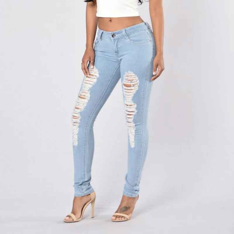 2018 женские потертые джинсы небесно-голубого цвета со средней талией, Стрейчевые джинсы, рваные обтягивающие джинсы для женщин