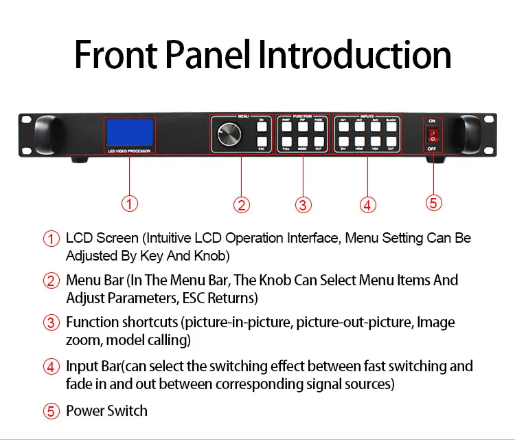 Полное выходное разрешение-светодиодный видеопроцессор предназначен для пользователей с удобным выходным разрешением, самым широким достигает 2560 точек, самым высоким из 1920 точек, для различных матричных дисплеев. До 20 видов разрешения выхода для пользователей на выбор, и может быть отрегулирован на точечный выход. Технология предварительного переключения-технология предварительного переключения, переключение входного сигнала переключается для предсказания заранее ли входной сигнал канала. Эта функция уменьшает отключение линии или может быть из-за того, что чехол без входного сигнала для переключения непосредственно приводит к ошибкам, улучшает показатели успеха. Обнаружение сигнала-светодиодный видеопроцессор автоматически определяет, есть ли вход сигнала или нет, когда соответствующие входы подключены, Если текущий канал имеет входной сигнал, канал сигнала Светодиодный индикатор светильник-это нормально и ЖК-дисплей экран покажет информацию о состоянии источника сигнала типа и разрешение; Если текущий канал не имеет сигнала или Девиантного, канал сигнала светодиодным индикатором светильник будет мигать, ЖК-дисплей экран показывает нет сигнала.
