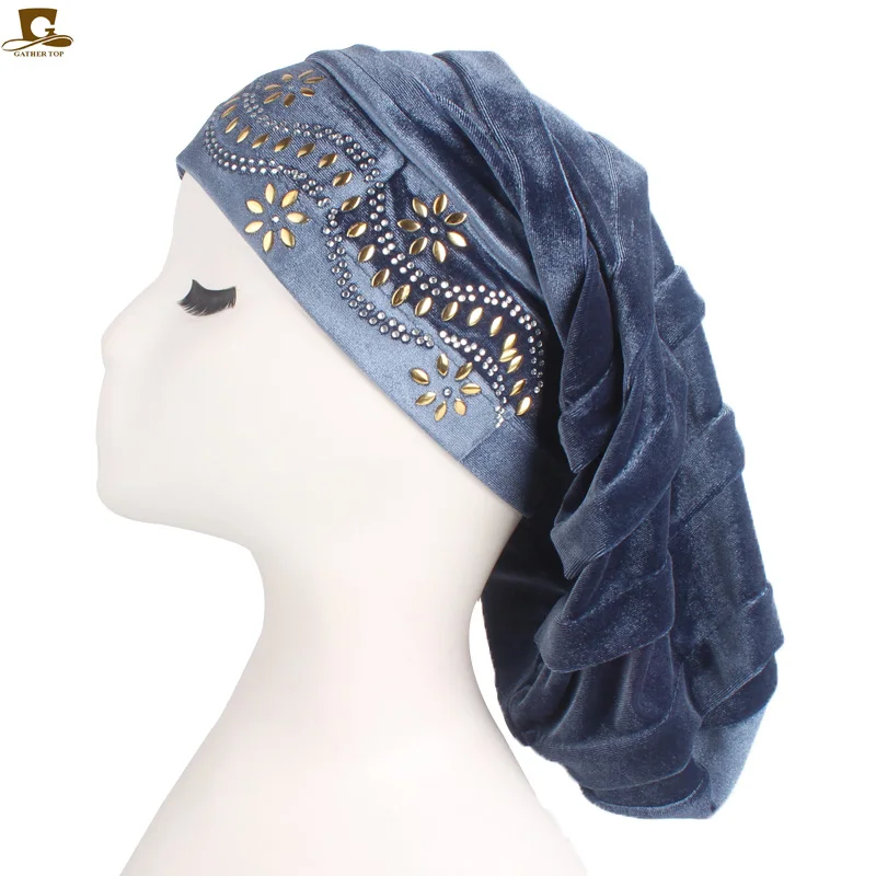 Бархатный плиссированный тюрбан со стразами, чепчик для сна, мешковатая шляпа для выпадения волос, мусульманские аксессуары для волос