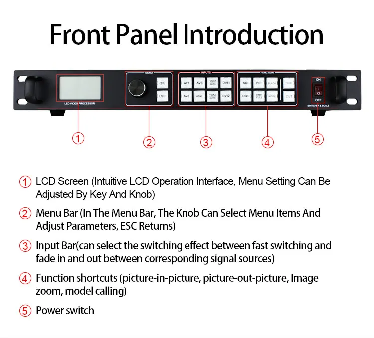 > Плавное переключение между любым каналом > Один ключ черный экран и замораживание > Поддержка большого соединения 10x10 > Функция цветопередачи > 34 показаны эффекты произвольного переключения > Максимальное выходное разрешение: 3840*640 @ 60Hz 2304*1152 @ 60Hz 2560*816 @ 60Hz > 8-канальный цифровой аналоговый видео вход: 3AV 2DVI 1HDMI 2VGA > Технология предварительного переключения > 16 тестовых образцов > Функция PIP, функция P0P > Предустановленное сохранение и отзыв