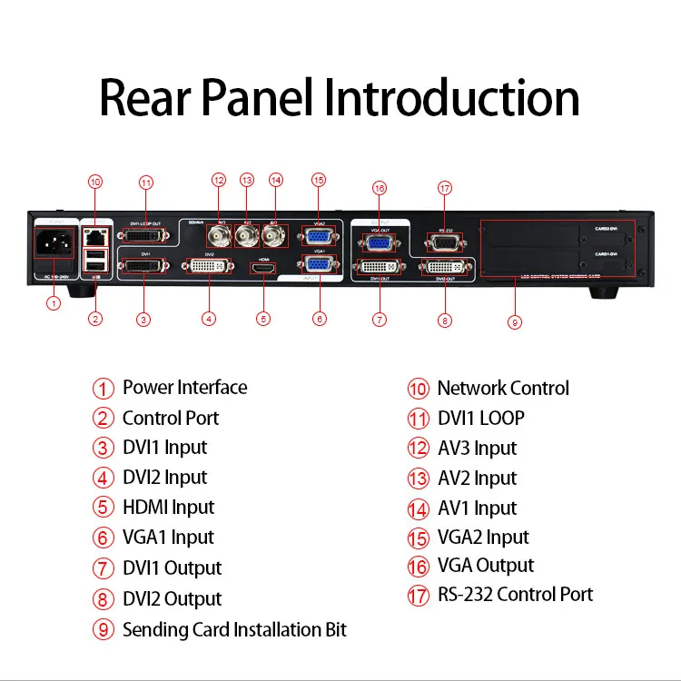 Более видео вход-светодиодный видеопроцессор 9-канальный видео вход, 3 CVBS, 2 VGA, 2 DVI, 1 HDMI,1 SDI/USB (расширяющийся) в основном охватывает гражданских и промышленных целей. Переключение всех видео входов позволяет быстро резать и выцветать переходы. Практичные интерфейсы видеовыхода-светодиодный видеопроцессор имеет три видеовыхода. 2 видеовыхода с использованием двух выходов DVI, включая выход VGA и выходы DVI, имеют один выходной разъем. После того, как эти три видео запрограммированы, чтобы отправить выход на светодиодную карту или монитор. Выход распределения видео DVI1 (LOOP OUT), в многомашинном соединении очень практичный, устраняя использование видео дистрибьютора, экономя пользователю утомительные соединения, уменьшая частоту сбоя подключения.