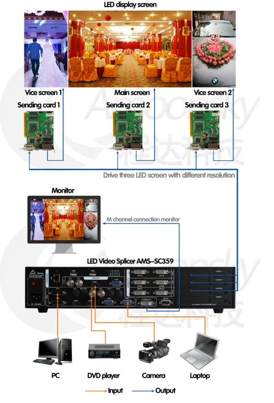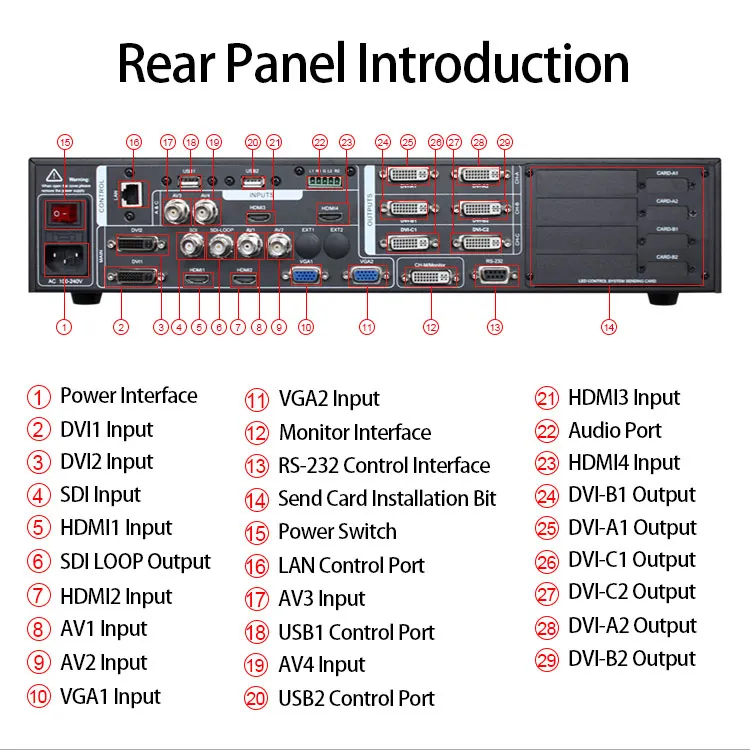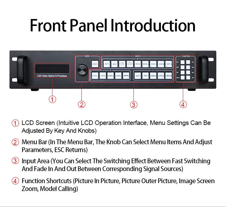 Светодиодный комбинированный процессор может вместить широкий диапазон входов Источники, может получить доступ до 13 видео входов, включая 2 DVI, 3 HDMI, 4 AV, 3 VGA и 3G-SDI (опционально). Каждый канал может принять стандарт Разрешение или видео сигналы высокого разрешения, DVI и VGA могут Получите до 1920 × 1200 @ 60 Гц разрешение ввода, чтобы удовлетворить различные Выход высокой четкости. Комбинированный процессор прост в использовании, Панель клавиш и система меню для завершения сложных настроек. RS-232 используется для дистанционного управления. -Различные вход Интерфейсы, для удовлетворения различных потребностей сигнала. Встроенный 4 светодиодный отправить открытку Место установки для удовлетворения требований к установке больших- Сенсорный экран POS терминалов