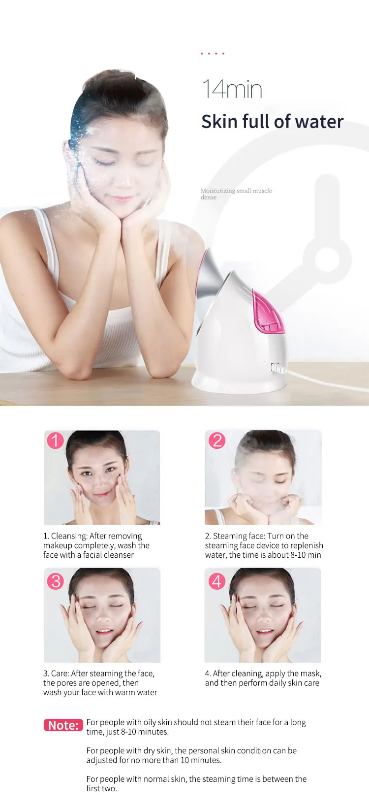 1. Резервуар для воды большой емкости 98 мл, время распыления до 10 минут, полностью открытые поры, способствует очищению для достижения глубокого очищения, эффективно удаляет пыль, масло, акне, акне, черные точки, акне на поверхности кожи.
