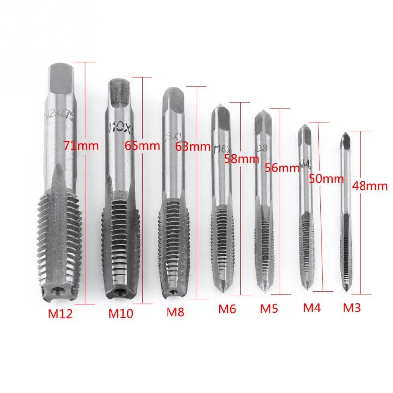 Эти краны изготовлены из высококачественной подшипниковой стали для высокой твердости. Есть всего 7 штук метчиков разных размеров от М3 до M12, которые вы можете использовать для нарезания резьбыРазличных нитей. Они используются для резки новых нитей или ремонта поврежденных нитей, у вас будетГладкий постукивание с ними. Эти краны используются с гаечным ключом для нажатия, гаечный ключ не входит в комплект. Отличные инструменты, используемые для создания резьбовых нитей на дереве, пластике, алюминии или многих других мягких материалах.