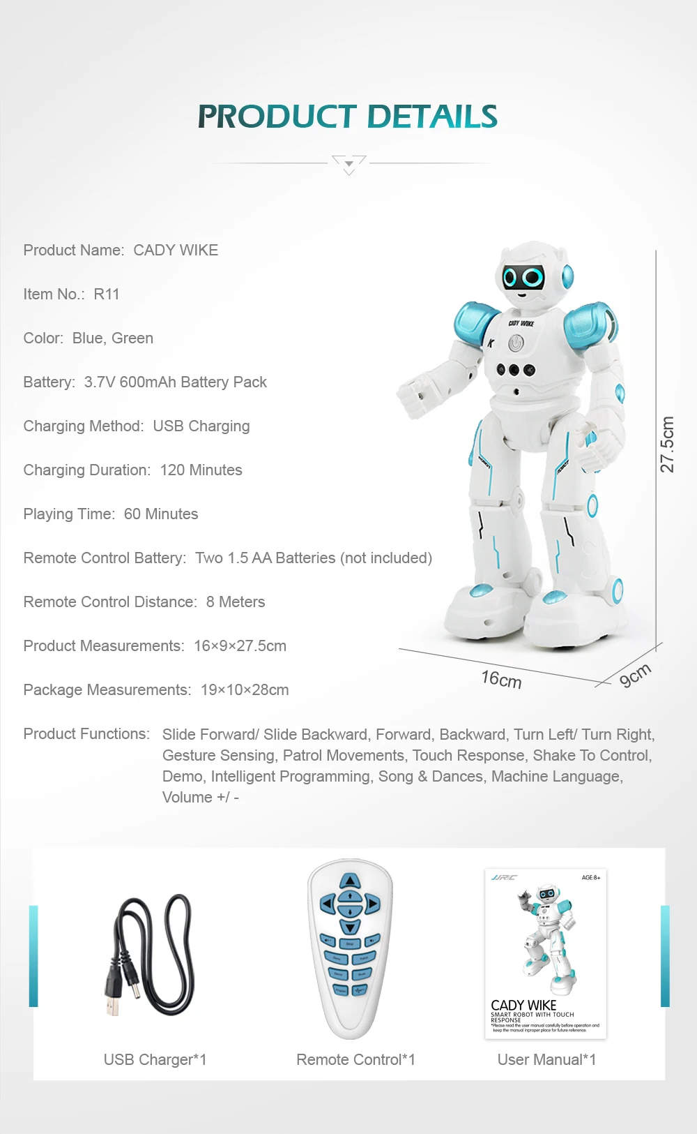 Описание: JJRC R2 CADY WIDA / WINI-это Интеллектуальный робот RC, который способен создавать много веселья для ваших маленьких детей. Когда ваша рука движется, датчик жестов обнаружит такое движение и сделает робота продвинутым, отступлением, поворотом влево/вправо. Интересно, что, поскольку он патрулирует вперед и встречает препятствия на своем пути, он будет двигаться назад, а затем поворачиваться влево/вправо. Чтобы создать больше удовольствия, вы можете программировать серию движений и видеть, как робот выполняет их ритмично с динамической музыкой.