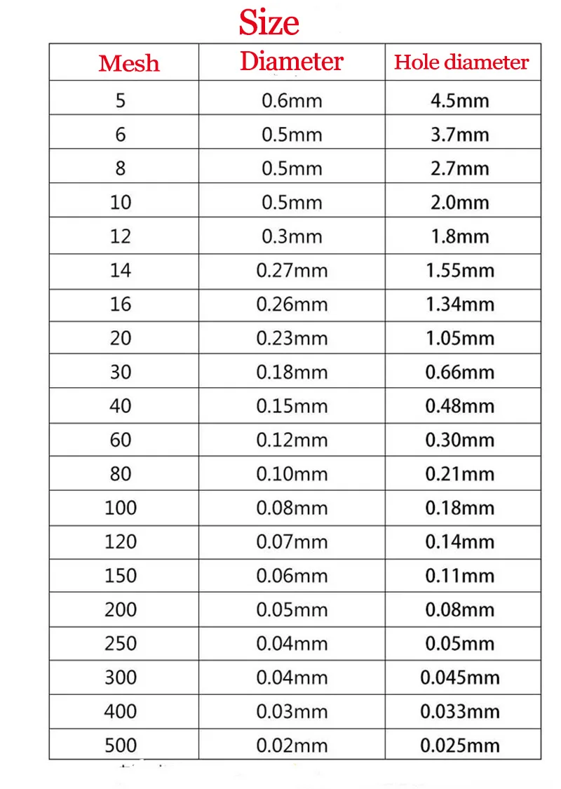 Mesh Count: 5 / 8 / 20 / 30 / 40