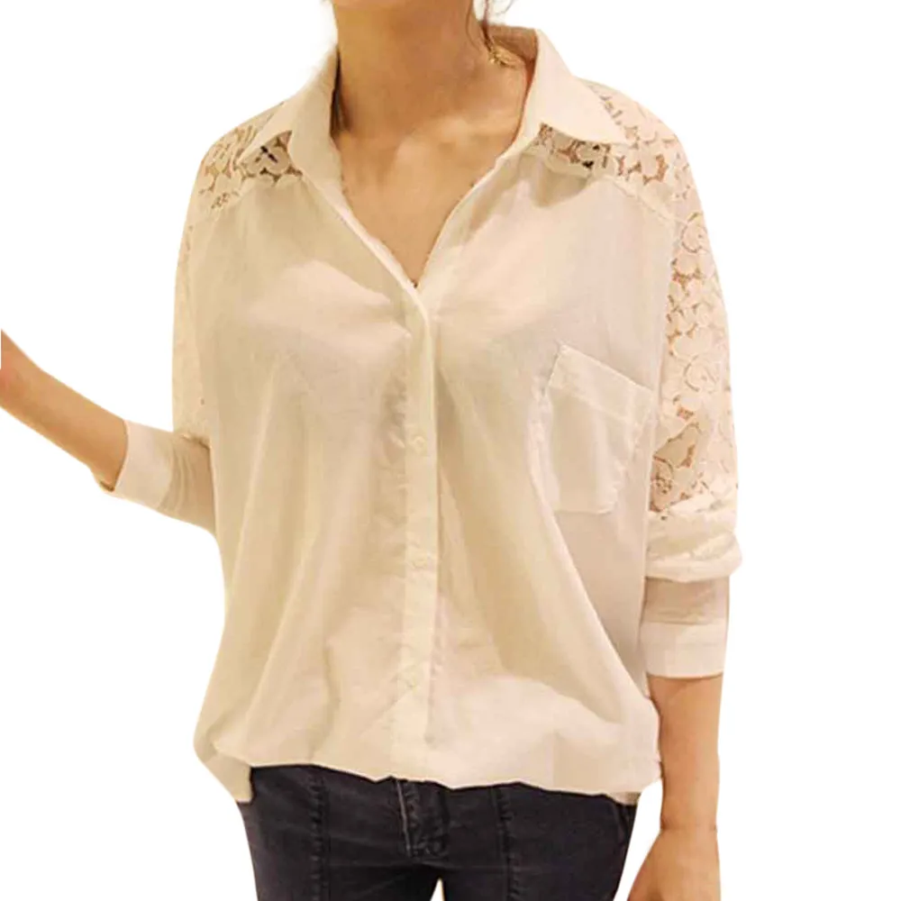 Женская Повседневная рубашка на пуговицах большого размера, однотонная кружевная Свободная блузка с длинным рукавом