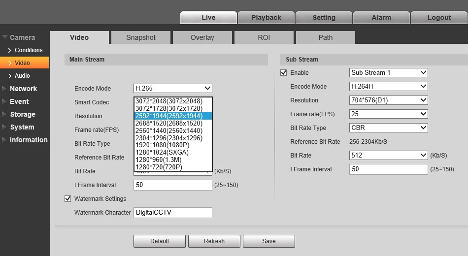 Resolution : 6M(3072×2048)/5M(3072x1728)/ 5M(2592×1944)/ 4M(2688×1520)/ 3M(2048x1536)/ 3M(2304×1296)/ 1080P(1920×1080)/1.3M(1280x960)/ 720P(1280×720)/ D1(704×576/704×480)/CIF(352×288/352×240)