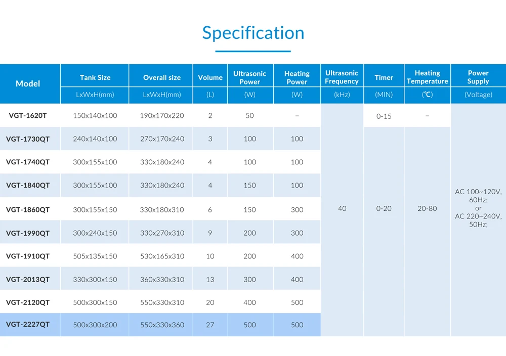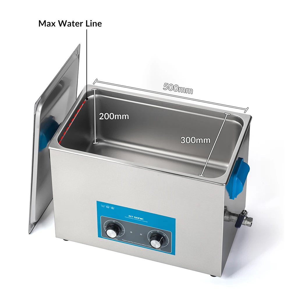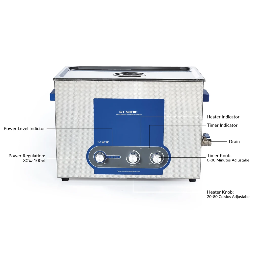 Мощность ультразвукового очистителя может быть изменена механически в 150-500w.температура очистки продукта может быть скорректирована механически произвольно в диапазоне 20-80 ℃, И время нагрева регулируется механически произвольно в течение 1-30 минут для удовлетворения различных потребностей в очистке.