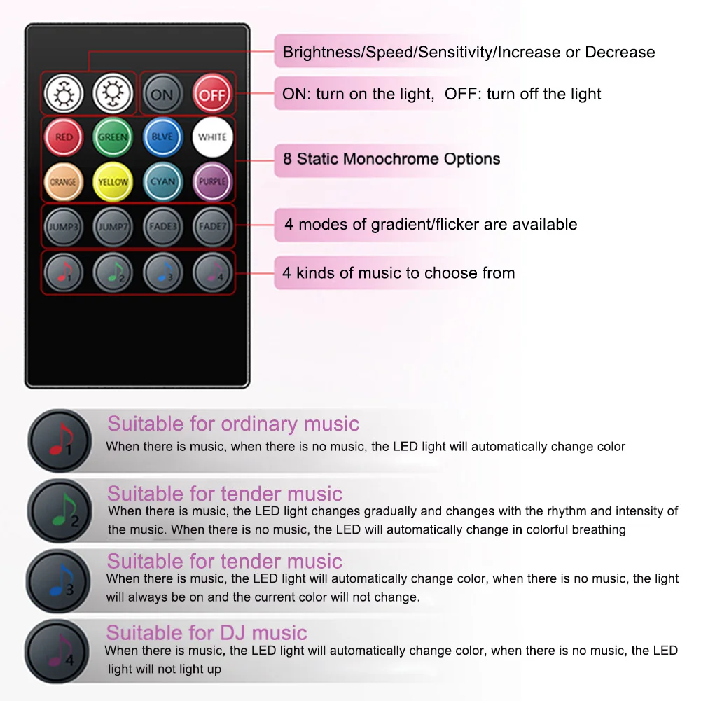 1) Напряжение: 12 В постоянного тока 2) Тип светодиодный: 5050 3) Длина из светильник линии: два из них являются 67 "(1700 мм), два других-46"(1180 мм) 4) Длина линии прикуривателя: 0,55 м 5) светильник: цветной (цвет s можно установить с помощью пульта дистанционного управления) 6) Установка: непосредственно поместите прикуриватель в гнездо прикуривателя, без каких-либо изменений проводов. 7) Мы не поставляем картонную коробку для этого продукта, мы будем хорошо защищать ее пузырчатой сумкой, если вам нужна картонная коробка, пожалуйста, свяжитесь со мной перед заказом. Спасибо