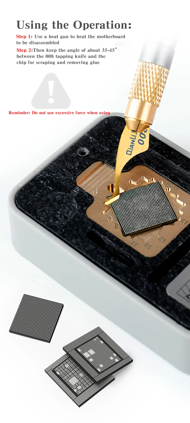 Описание: -- Легко удалите клей материнской платы -- Подходит для чипа материнской платы/процессора/Baseband/жесткого диска