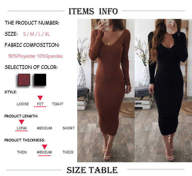 Материал: полиэстер Пол: женщин Стиль: вязаное длинное платье Стиль: Повседневный, Сексуальный Вырез: v-образный вырез Сезон: зима Рисунок: однотонный Длина платья: до колена Тип ткани: вязание Цвет: черный, коричневый Размер: S, M, LLПожалуйста, перед покупкой ознакомьтесь с фактическим ростом и таблицей размеров. Спасибо.