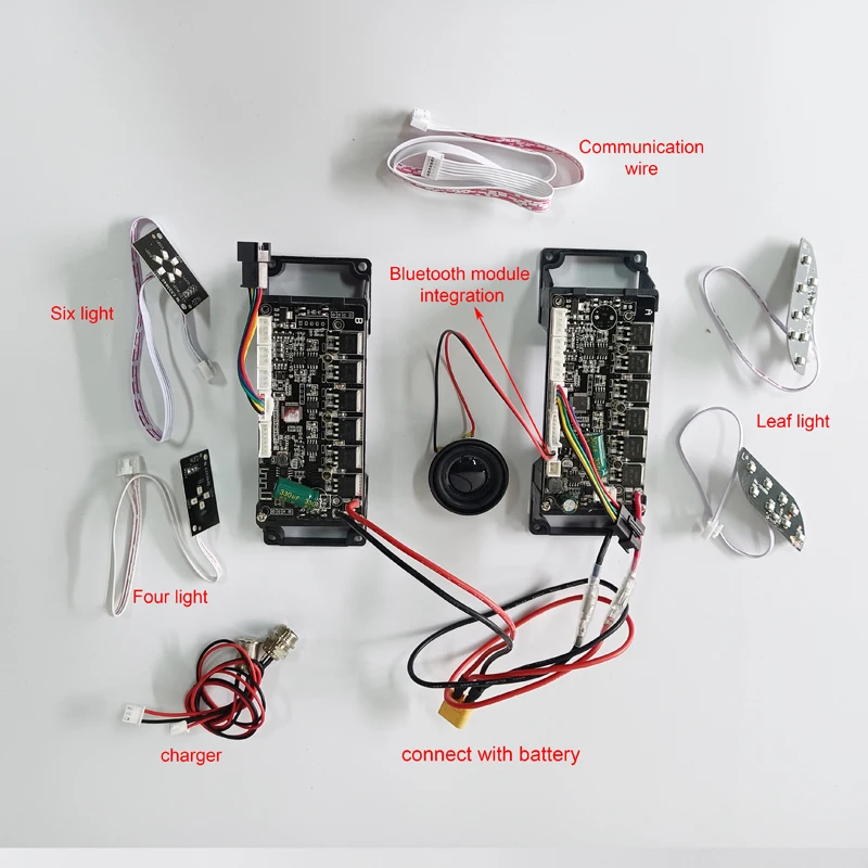 1 Материнская плата 2 гироскутера, 2 панели переднего светодиодный освещения 2 платы индикатора питания, 1 линия зарядного устройства 1 силовой провод с переключателем 1 модуль Bluetooth 1 динамик 3 Вт