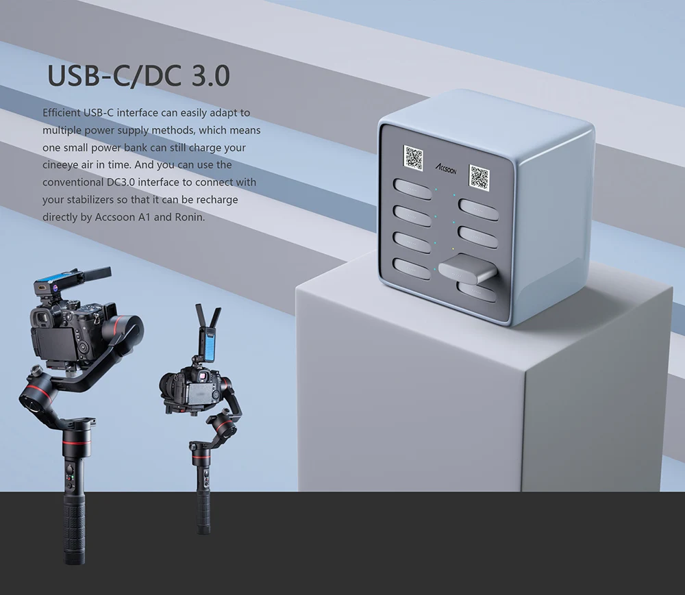 Позволяя пользователю использовать свой собственный источник питания, CineEye Air может работать, как долго вам это нужно.