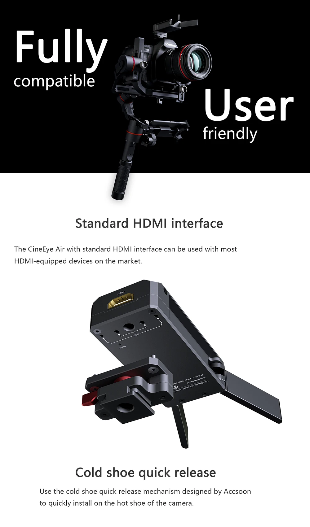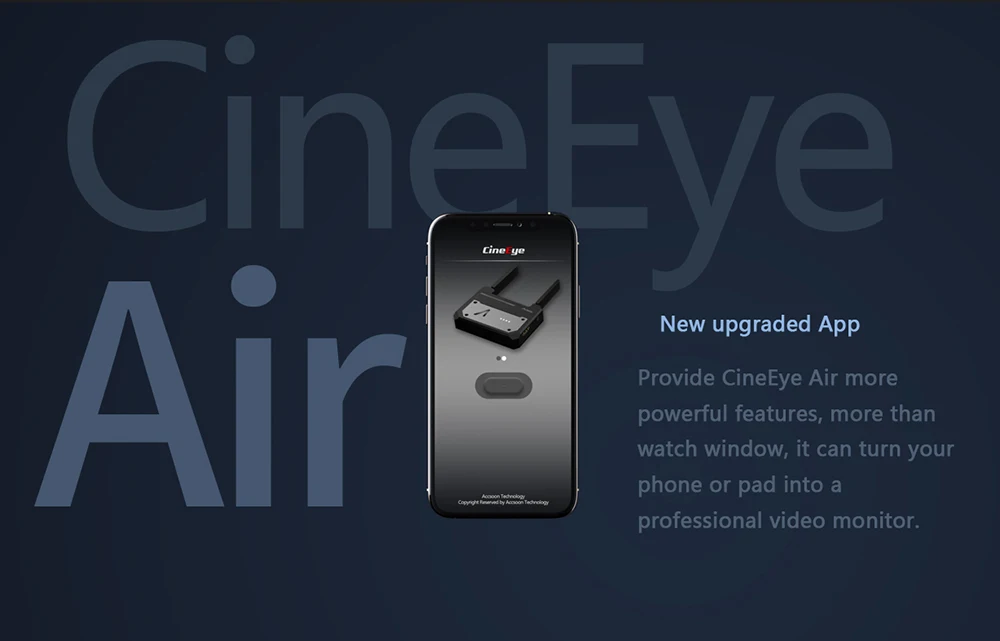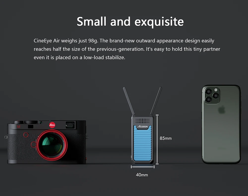 Accsoon CineEye Air-это легкая беспроводная система передачи видео, которая позволяет передавать видеосигнал 1080p с камеры на два мобильных устройства.