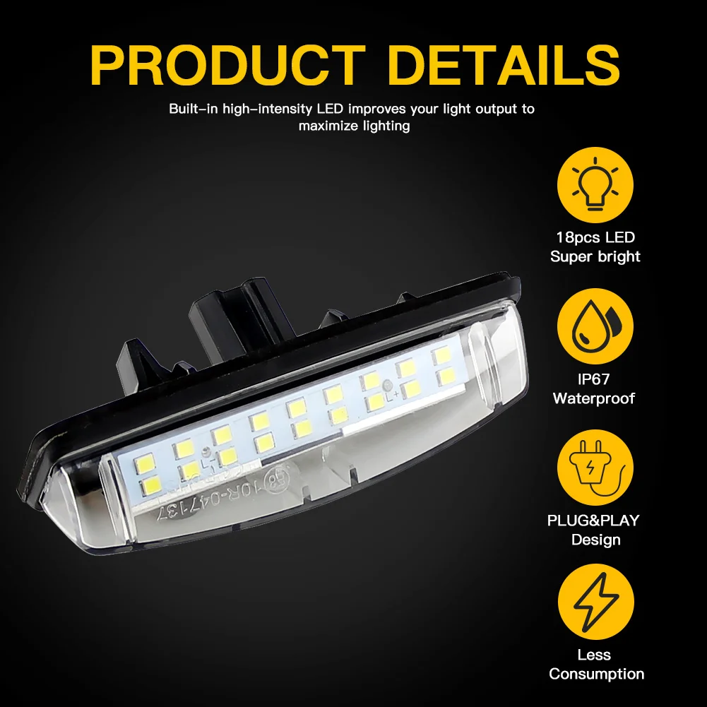 Он оснащен одной парой высокой мощности без ошибок светодиодный номерной знак. Каждый светильник номерного знака оснащен 18 шт. 2835 SMD, производя супер яркий светильник. Низкое энергопотребление, высокая эффективность и энергосбережение. Прямая установка, без проводки или модификации, просто подключите и играйте. Не повреждает оригинальный корпус. Нет ошибок obc на всех моделях приложений. Светодиодный Тип: 2835 SMD Количество СВЕТОДИОДНЫЙ: 18 шт. (каждый) Светильник Цвет: белый Светильник Цвет: 6500-7000K
