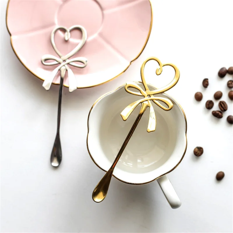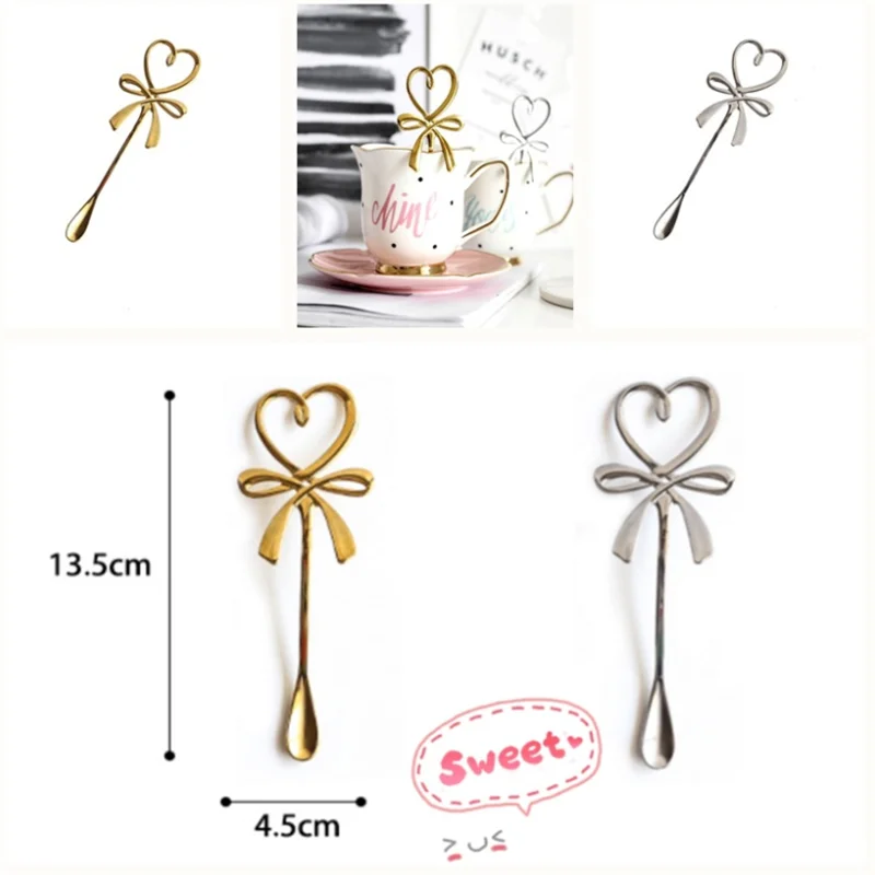Новая мини-кофейная ложка в форме сердца с 3D бантом, чайная десертная ложка, подвесная ложка, серебряная ложка, столовые приборы из нержавеющей стали