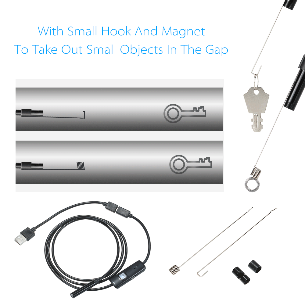 * Эндоскоп оснащен доставая аксессуары, которые делают проще доставать мелкие предметы в зазоре и благоприятны для ежедневного поддержания в исправном состоянии.