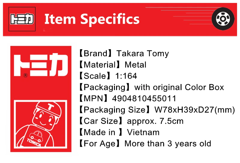 Номер товара. : 4904810455011 Производитель: TAKARATOMY Бренд: Tomica Размер посылка: W78 x H39 x D27 мм Целевой возраст: 3 года ~