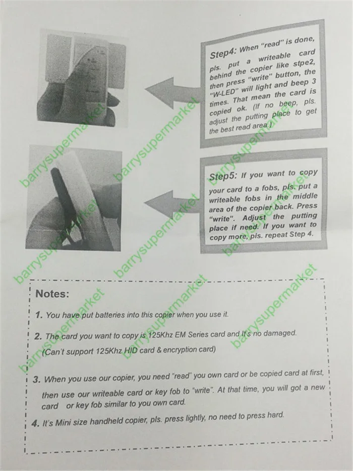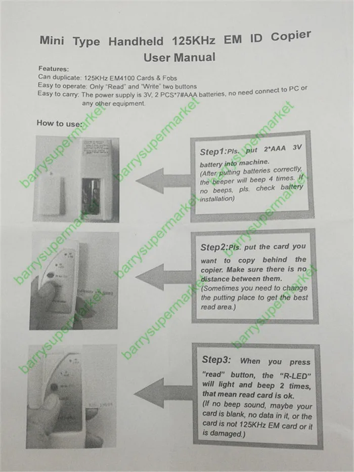 1. Источник питания (питание): номер семь батарей, два аккумулятора AAA. (мы не предоставляем батарею)2. Указывающая лампа (светодиодный индикатор рабочего состояния): три рабочих указателя лампы, чтение, питание, запись3. Кнопка (кнопка): кнопка чтения (кнопка чтения), кнопка записи (кнопка записи).Шаг 1, Поместите карту копии возле дубликатора карты.Шаг 2, нажмите кнопку чтения, зуммер будет звонить два раза;Шаг 3, поместите записываемую карту рядом с дубликатором, нажмите кнопку записи, зуммер будет звонить три раза. Затем пишите успешно.Шаг 4. Если вы хотите копировать больше идентификационных карт, повторите шаги 3.Примечание: вам лучше вынуть аккумулятор, когда вы его не используете.Особенности:Может дубликат чипа: 125 кГцEM4100/EM4001/EM4102/TK4100EM4305T5577/T5557/T55665200/6608/CET5577/CET5520 и т. д. или совместимые карты, брелокиОн не может поддерживать HID картуЕсли вы не уверены, какой чип вашей карты или брелока, пожалуйста, свяжитесь с нами, спасибо!Если вы хотите крупный заказ или другое требование, пожалуйста, свяжитесь с нами, спасибо!Удобный для пользователя: только две кнопки: кнопка чтения и записи, нет необходимости подключать любое другое оборудование.Встроенный светодиодный индикатор и звуковой сигналВстроенная приемопередаточная антеннаАккумулятор: 3 в (2 батареи AAA батарея) (не входит в посылка)Размер: 102x38x13 ммОбожаю пить чай с красивой посуды,но так как в доме имеются маленькие детки,то посуда у нас долго не живёт.Приглянулся недавно... Читать отзыв полностью...