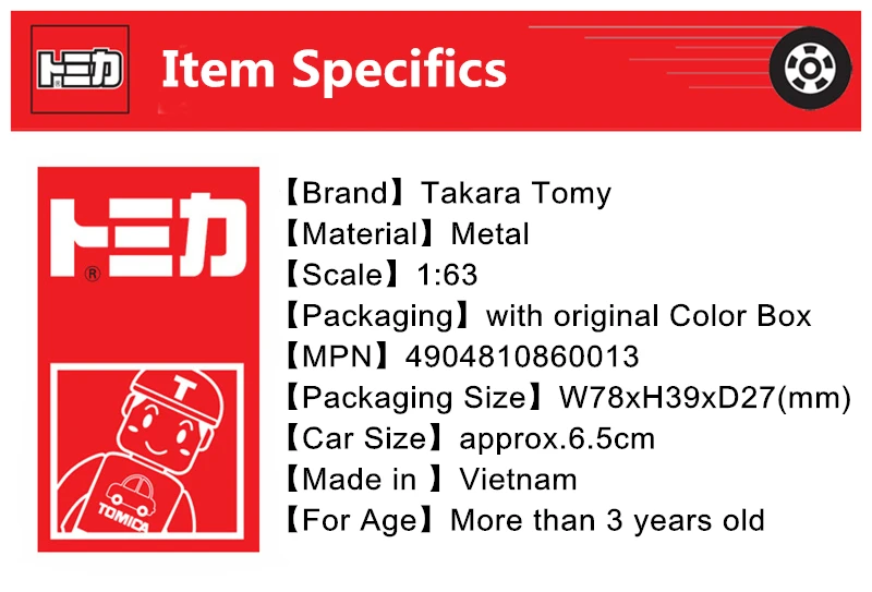 Номер товара. : 4904810860013 Производитель: TAKARATOMY Бренд: Tomica Размер посылка: W78 x H39 x D27 мм Целевой возраст: 3 года ~