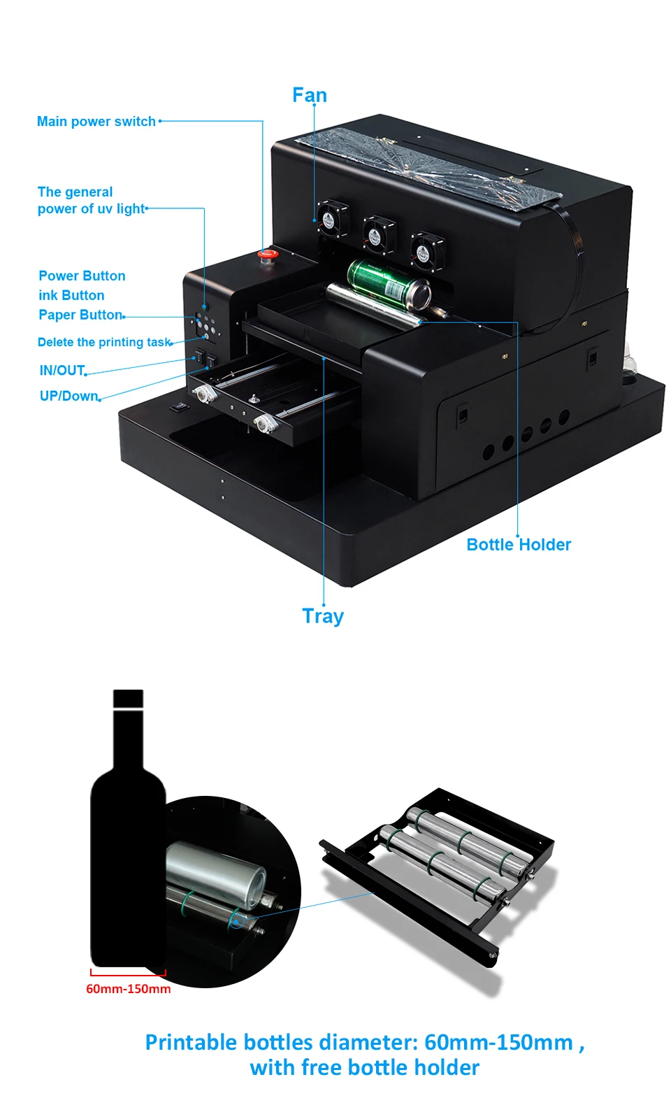 2. Бутылки для печати (диаметр: 60 мм-150 мм), с бесплатным держателем для бутылок.