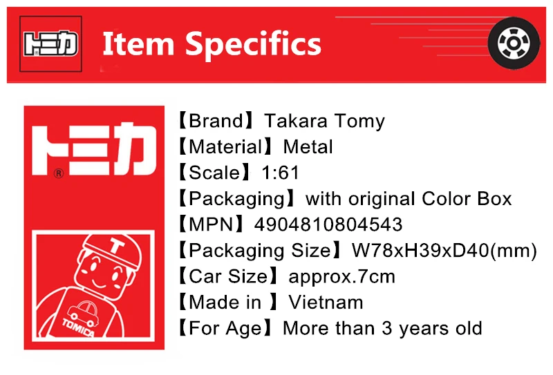 Номер товара. : 4904810804543 Производитель: TAKARATOMY Бренд: Tomica Размер посылка: W78 x H41 x D39 мм Целевой возраст: 3 года ~