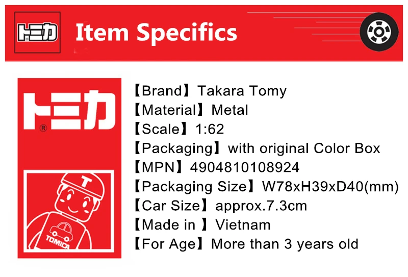 Номер товара. : 4904810108924 Производитель: TAKARATOMY Бренд: Tomica Размер посылка: W78 x H41 x D39 мм Целевой возраст: 6 лет ~