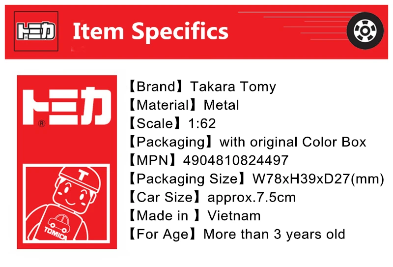 Номер товара. : 4904810824497 Производитель: TAKARATOMY Бренд: Tomica Размер посылка: W78 x H39 x D27 мм Целевой возраст: 3 года ~
