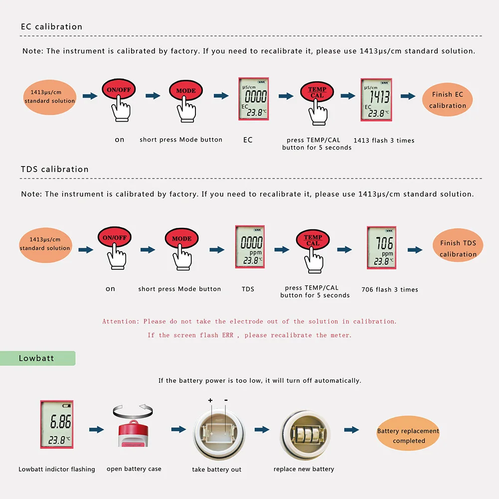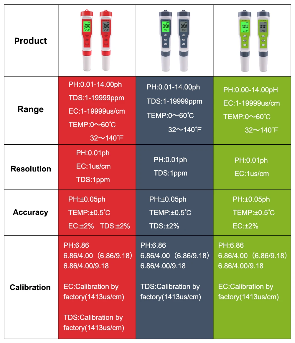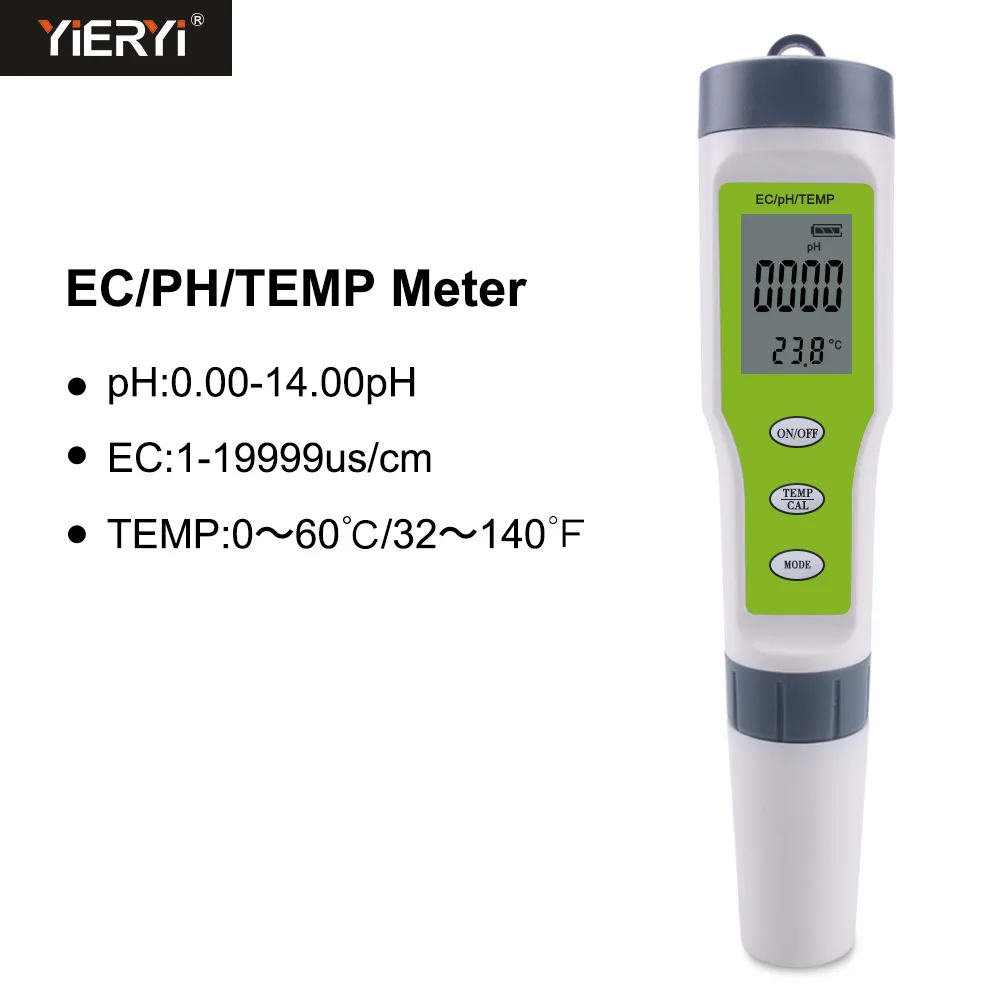 • Диапазон измерения: pH: 0,00-14,00 pH; EC: 0-19990muS/см • Разрешение: 0,01 pH; 1muS/см; 0,1 ℃; 0,1 degF ► Точность: pH: +/-0,01 pH; EC: +/-2%; Температура: 0,5 ℃ ► Батареи: 3*1,5 V LR44 кнопочный элемент (не прилагаются) ►Temp. : 0,1-60,0 ℃; 32,0-140,0 degF ►Калибровка: pH: автоматическая калибровка с тремя точками (6,86 & 4,00 & 9.18pH); EC: 1413muS/см ►Автоматическое отключение: 5 минут