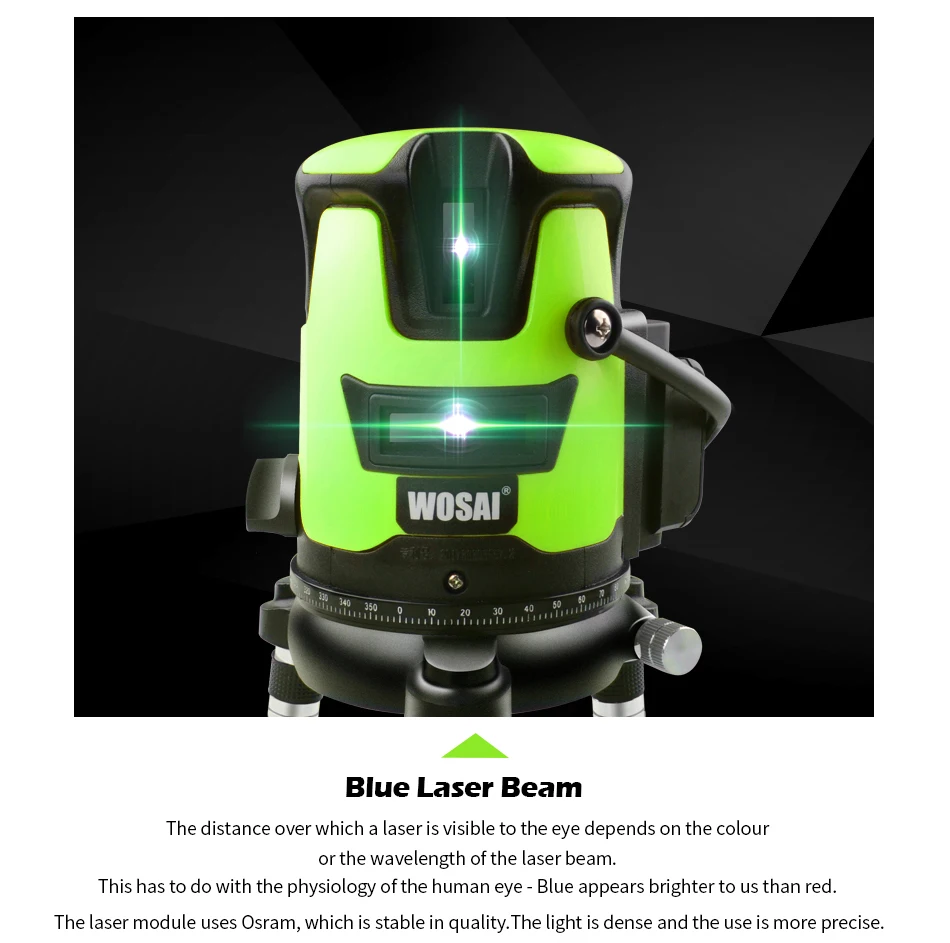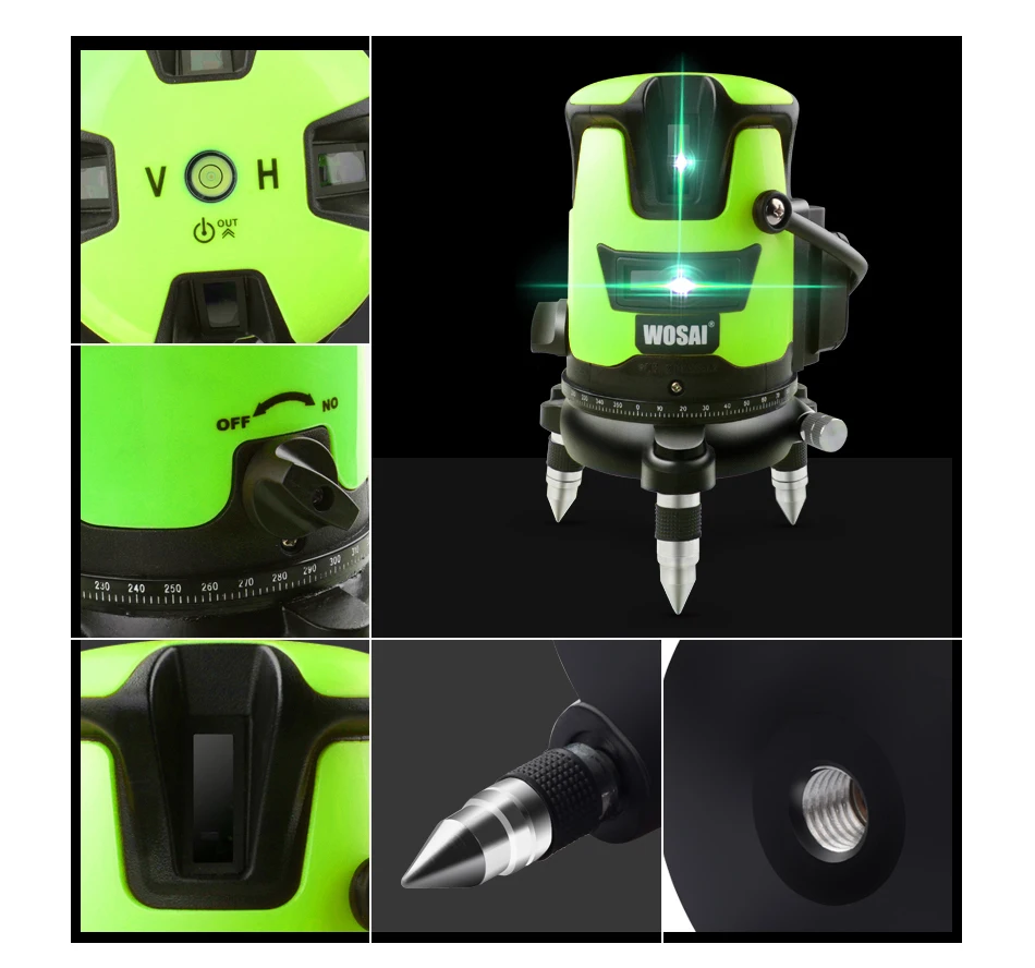 Технические детали Модель номер: WS-V5 Тип лазера: Класс II 532 нм ≤ 1 мВт Лазерный луч: Зеленый Выравнивания Тип: 4V1H1D Точность: 1 мм на 5 м/1/25 дюйма на 16,5 футов Рабочий диапазон: Радиус 10 м (30 м с детектором) Диапазон самонивелирования: ± 3 ° Тип батареи: 3 * AA, 1,5 В (не включает) Штатив с резьбой: 5/8" Рабочая температура: -10 °C-4 °C Рабочая среда: В помещении/на открытом воздухе Зарядное устройство, адаптер, вход: 100-240 В переменного тока 50-60 Гц WS-V5 5 линий 6 точек синий лазерный уровень WS-V5 идеально подходит для украшения дома, установки пола, каркаса и укладки плитки и т. Д. Расстояние, на котором лазер виден глазу, зависит от цвета или длины волны лазерного луча. Это имеет отношение к физиологии человеческого глаза-синий цвет для нас выглядит ярче, чем красный. Лазерный модуль использует Osram, которая стабильна в качестве. Свет плотный и использование более точное ..