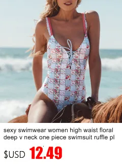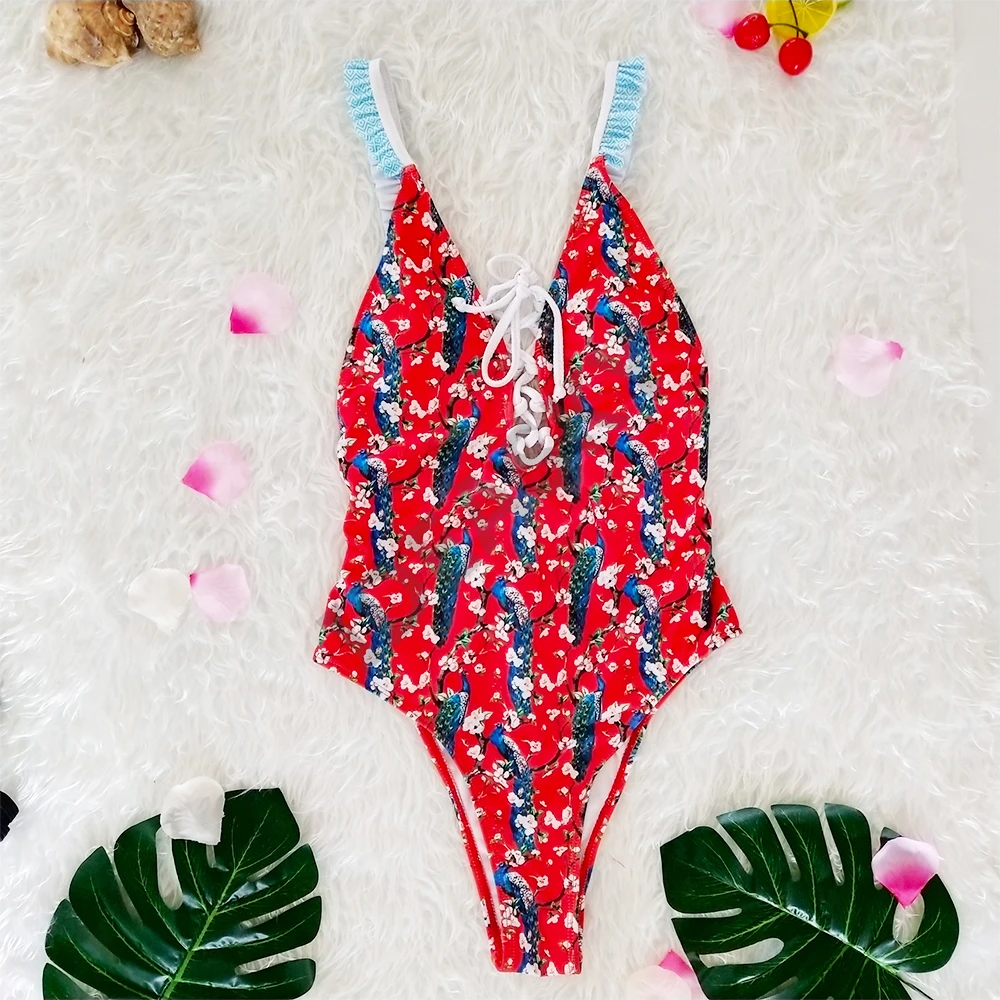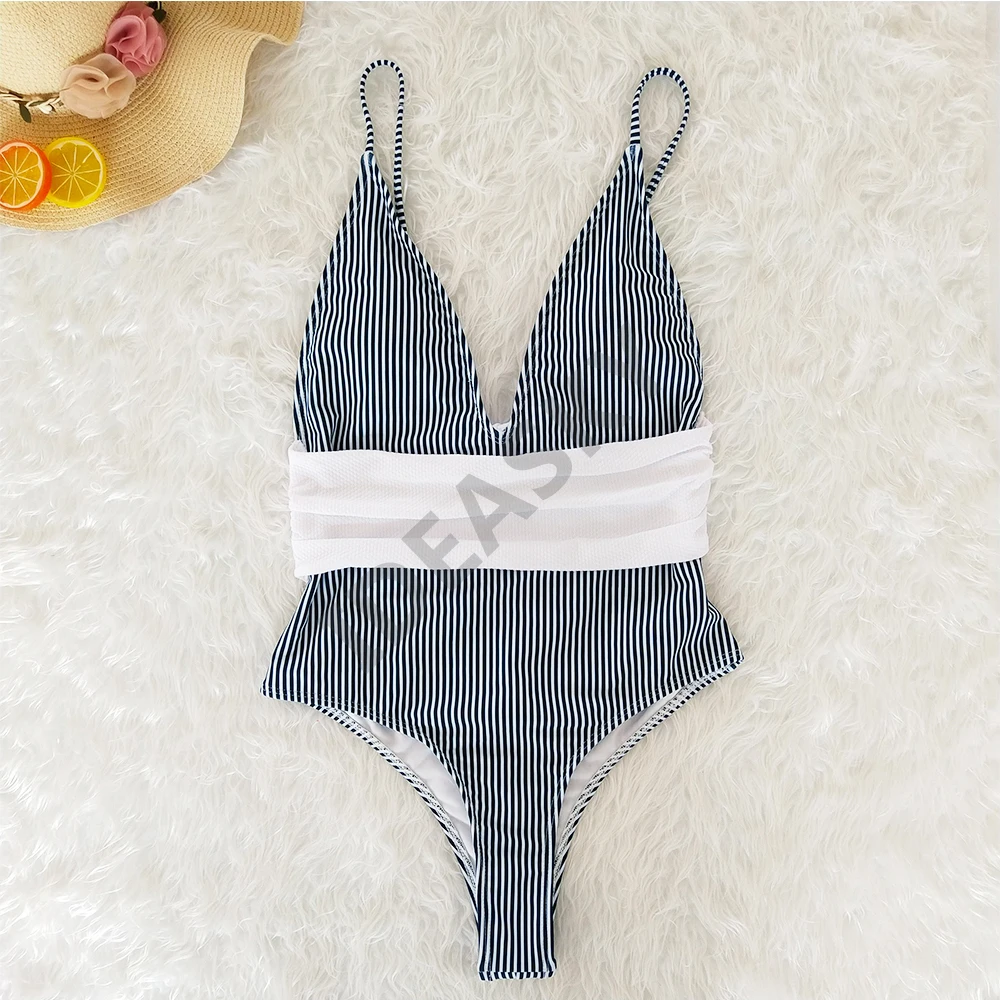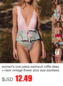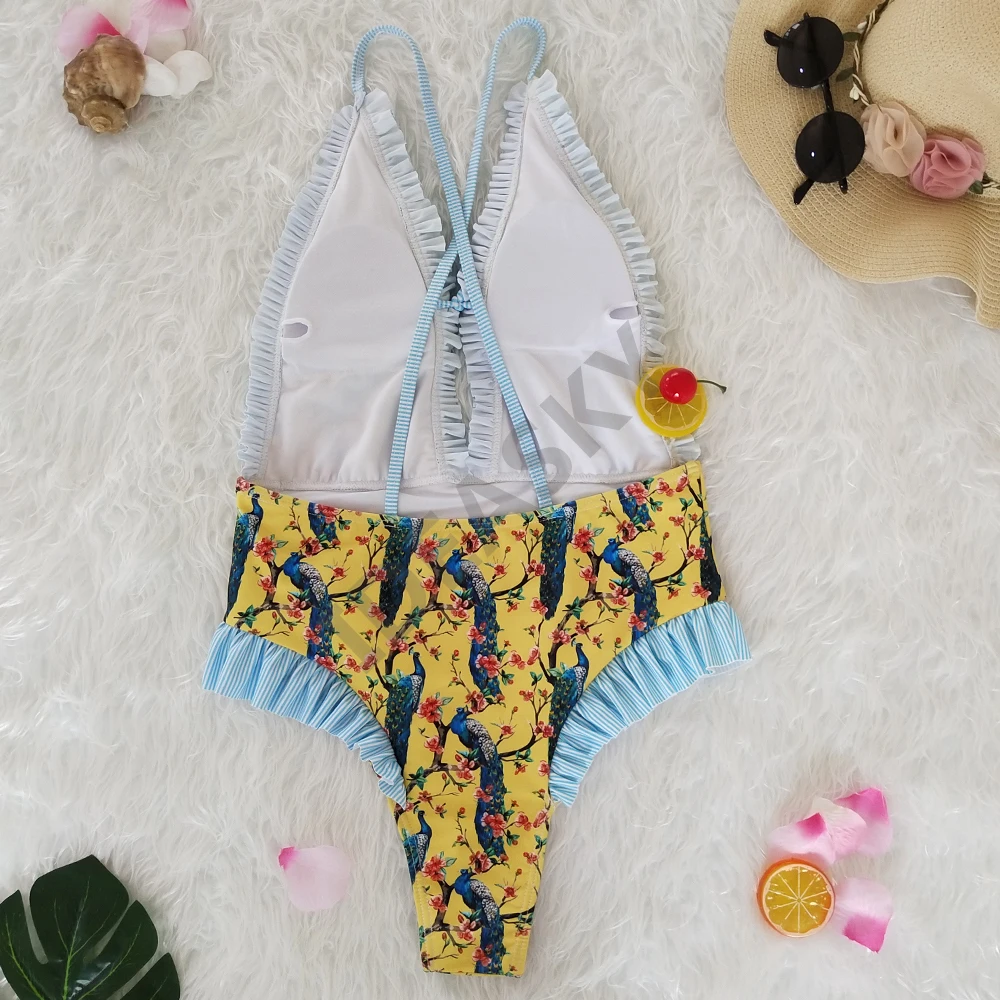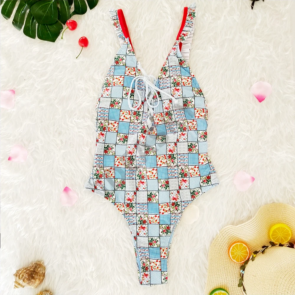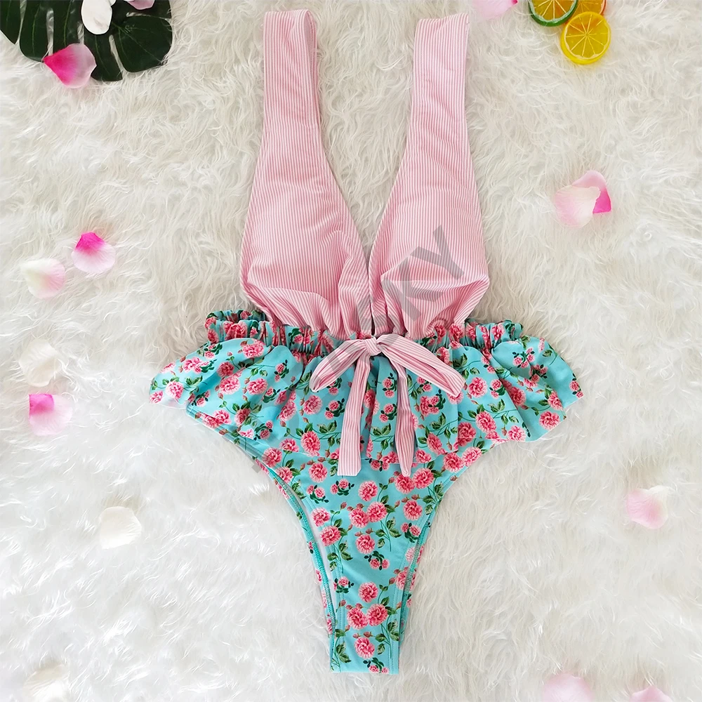 Женский слитный купальник с оборками, глубоким v-образным вырезом, винтажный цветочный купальник размера плюс с открытой спиной, женский купальник с высокой талией и цветочным принтом в полоску