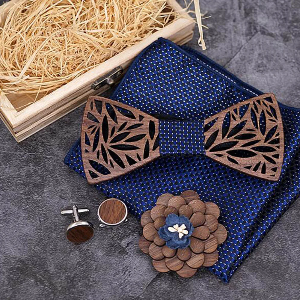 Мужские 4 шт клетчатые бантики деревянные полые резные запонки в форме бабочки носовой платок Набор