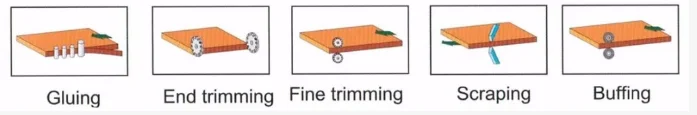 Склеивание, Концевая резка, грубая обрезка, тонкая обрезка, соскабливание, полировка