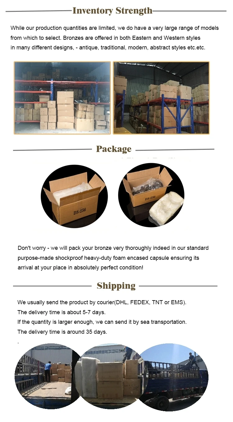 7 дней доставки-наша фабрика является профессиональным производителем бронзовых металлических изделий, бронзовых подарочных изделий и бронзового художественного декора. В настоящее время у нас есть огромный запас более 500 штук, из которых вы можете выбрать. Мы постоянно добавляем дополнительные модели в наш ассортимент. Каждая модель либо имеется в наличии, и доступна для немедленной покупки (отправляется в течение 7 дней с момента заказа), либо в качестве альтернативы может быть произведена довольно быстро, так как мы имеем формы для каждой модели.