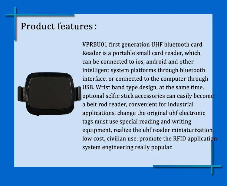 Портативные мини-часы UHF rfid-считыватель, bluetooth, кодировщик, копировальный аппарат Протокол: EPC C1G2,ISO18000-6c Частота: UHF,902-928 МГц Интерфейс: Bluetooth BLE4.0,USB Расстояние чтения: 50 см (в зависимости от размера этикетки) Размер: 66*45*15 мм Материал: АБС-пластик + Поликарбонат, инженерный пластик Емкость аккумулятора: 550 мА Время работы: 3 часа непрерывной работы около 30000 раз запрос Режим зарядки: USB 5 В/0,5 А Звуковой сигнал: встроенный зуммер Бесплатный SDK: Поддержка IOS,Android,Windows,Wechat, мини-программа Рабочая температура: от-20 ℃ до + 60 ℃