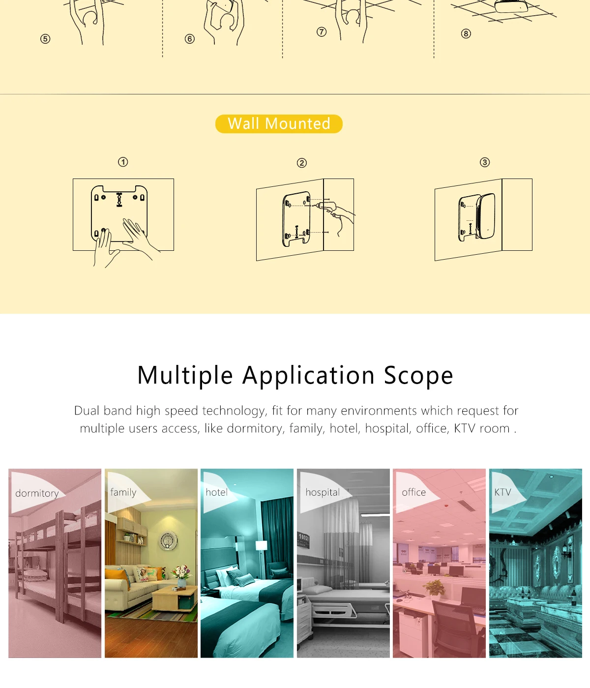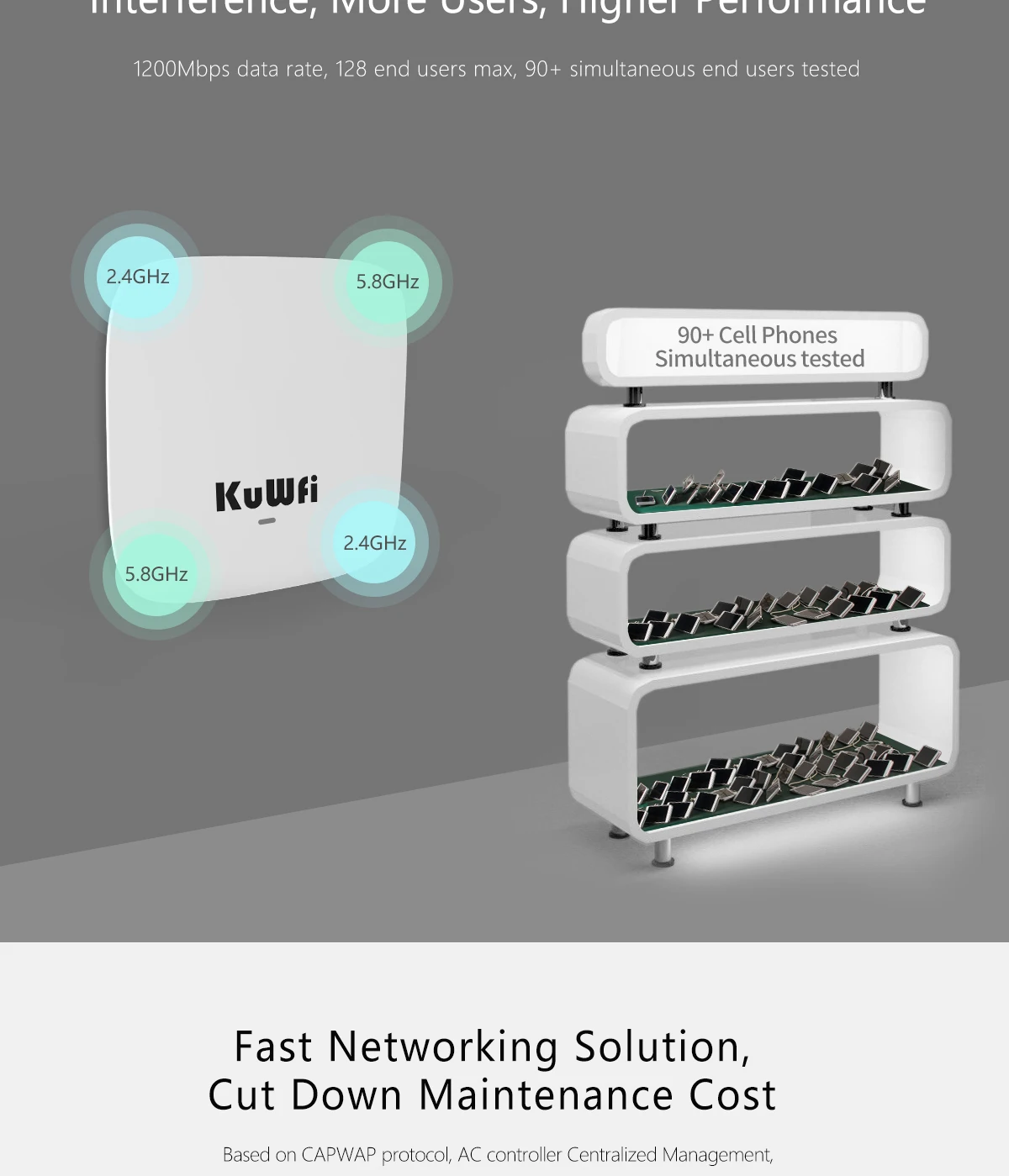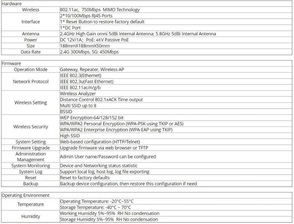 Соответствует требованиям 802.11ac/b/g/n MIMO Технология, 750 Мбит/с быстрее скорость передачи данных, 80 + одновременно конечных пользователей; 2,4 ГГц и 5 ГГц dual band, меньше частотных помех для обеспечения стабильного беспроводного покрытия.