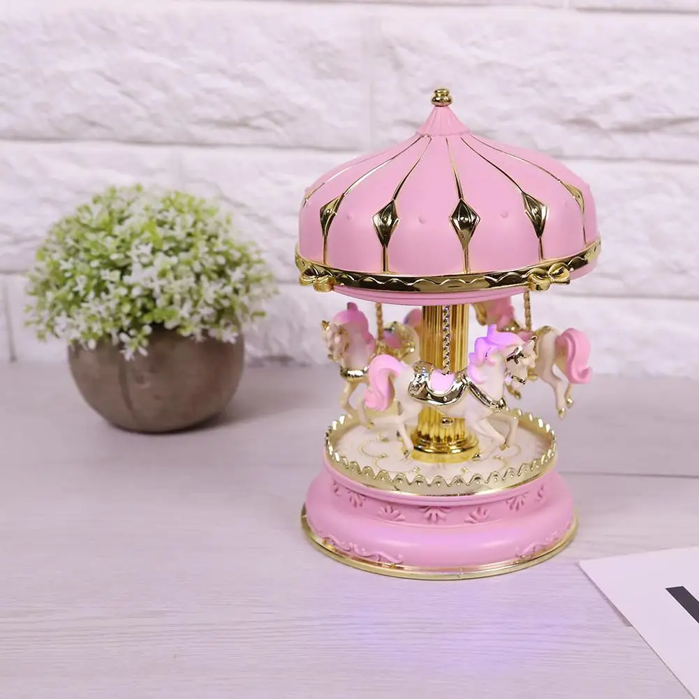 Изготовлен из высококачественного материала, красивый, без запаха и долговечный. Легкий и портативный дизайн, можно разместить на любом месте. Декор и светильник с золотыми краями создают ощущение роскоши, элегантности и снов. Романтическая музыкальная шкатулка, три лошади карусели, можно использовать в качестве подарка, художественного произведения или орнамента. Отличное качество изготовления, отличный подарок для ваших детей, друзей и любимых.