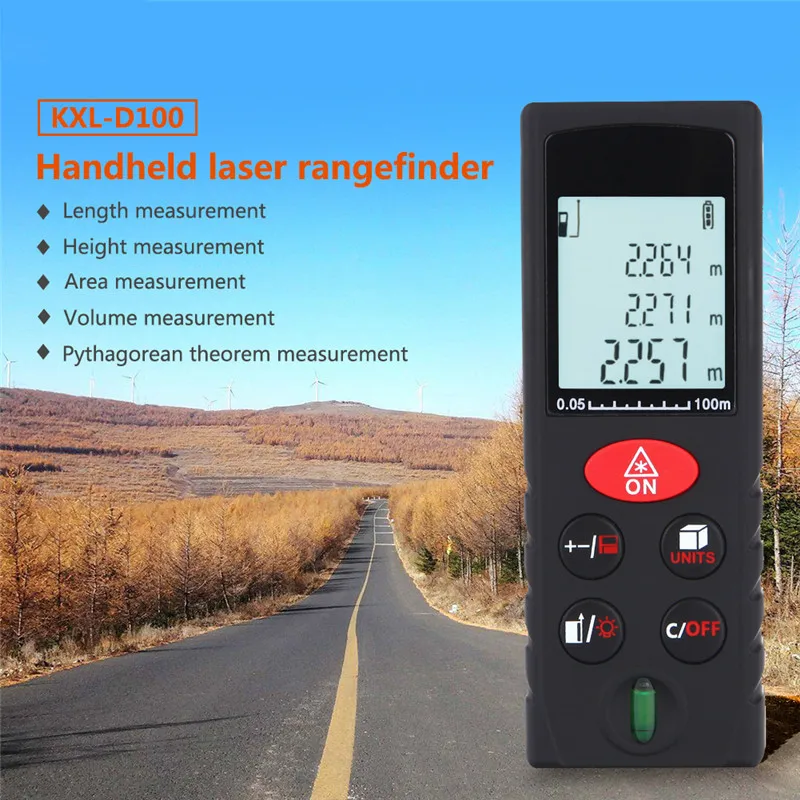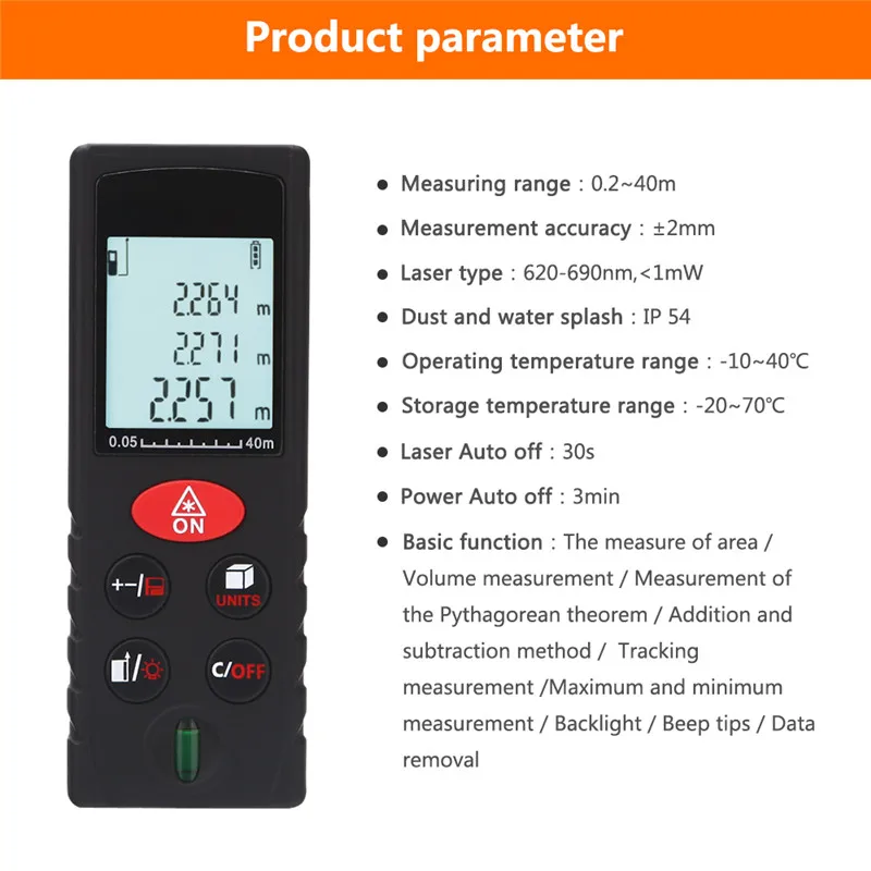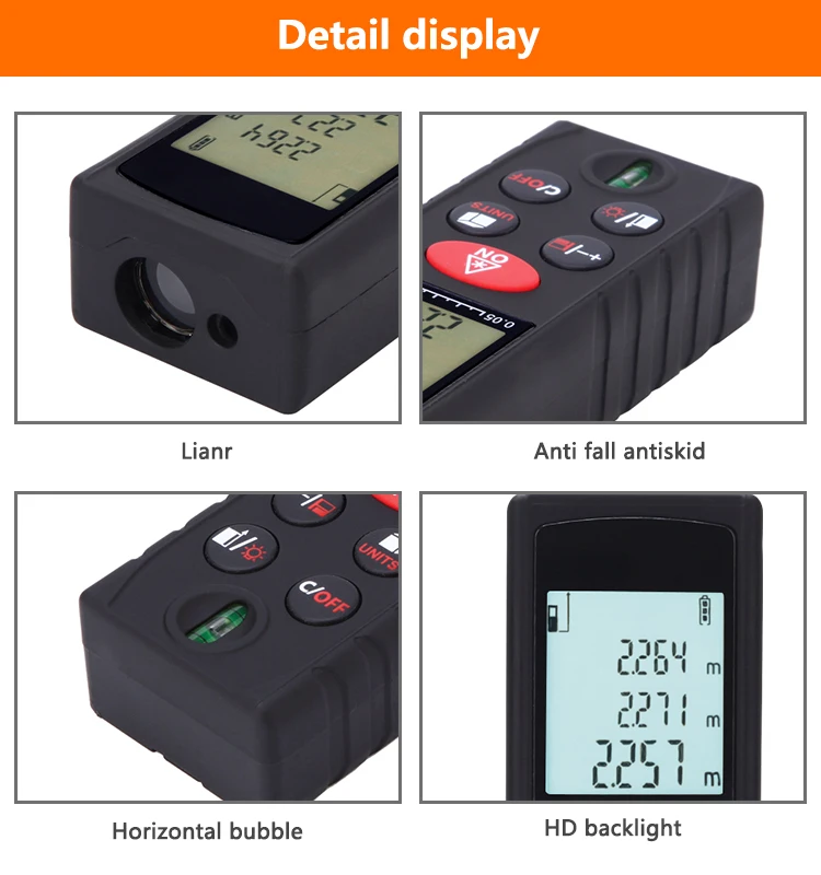 Особенности: Мини цифровой лазерный дальномер с высокой точностью и широким диапазоном измерения. Быстрое измерение расстояния, площади, объема, непрямого измерения по теореме Пифагора. Одно измерение и непрерывное измерение. Переключаемый блок: метр (м), дюйм (дюйм), фут (фут) и т. Д. Пузырьковый уровень оснащен как инструмент Уровня Духа. Легкое Таргетирование с яркой лазерной указкой. Максимальное/минимальное измерение. Информация о размерах регулируется. Легкое сложение и вычитание измерений. 20 групп записей данных и функция отзыва. Мини-размер и портативный дизайн, портативный и удобный. Большой ЖК-дисплей с подсветкой. Звуковым индикаторами.