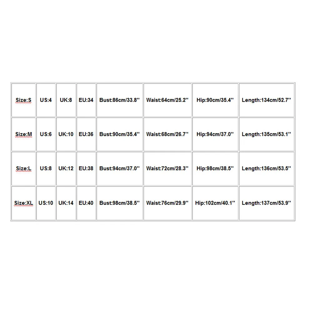 Размер: SСША: 4Великобритания: 8ЕС: 34Обхват груди: 86 см/33,8 дюймаТалия: 64 см/25,2 дюймаОбхват бедер: 90 см/35,4 дюймаДлина: 134 см/52,7''Размер: MСША: 6Великобритания: 10ЕС: 36Обхват груди: 90 см/35,4 дюймаТалия: 68 см/26,7 дюймаОбхват бедер: 94 см/37,0 дюймаДлина: 135 см/53,1''Размер: LСША: 8Великобритания: 12ЕС: 38Обхват груди: 94 см/37,0 дюймаТалия: 72 см/28,3 дюймаОбхват бедер: 98 см/38,5 дюймаДлина: 136 см/53,5''Размер: XLСША: 10Великобритания: 14ЕС: 40Обхват груди: 98 см/38,5 дюймаТалия: 76 см/29,9 дюймаОбхват бедер: 102 см/40,1 дюймаДлина: 137 см/53,9''