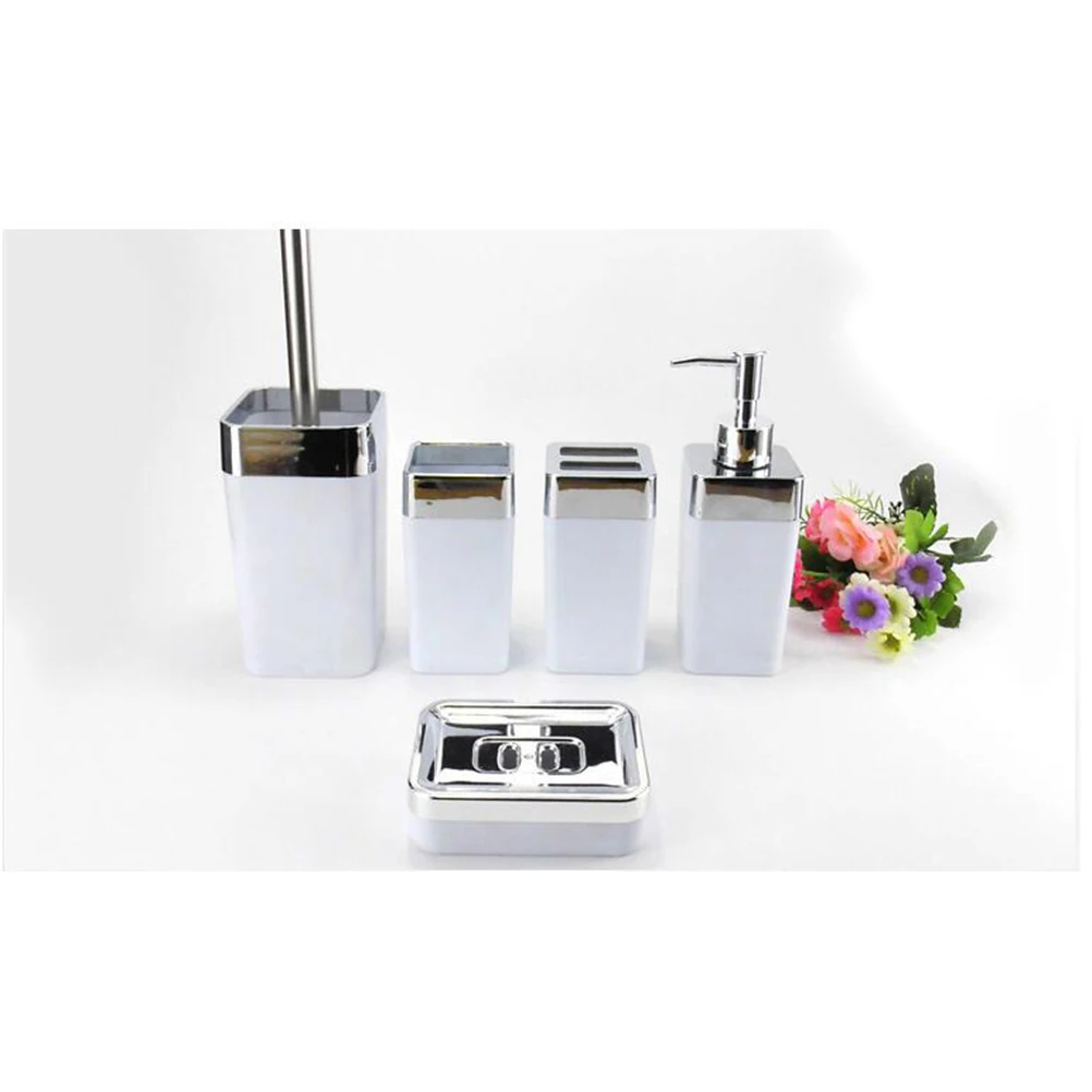 Это набор из 5 инструментов для ванной, в том числе 1 бутылка для лосьона, 1 стакан для зубов, 1 стакан для зубной щетки, 1 держатель для мыла и 1 Туалетная щетка. Они изготовлены из высококачественного материала, прочные и могут служить долго. Они разработаны простым и стильным образом, легко помещается в любых ванных комнатах.