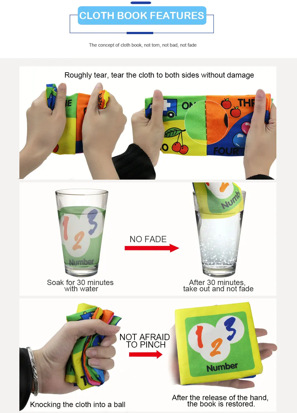 1. Передняя и задняя крышки каждой книги снабжены звуком pape. 2. Эти книги изготовлены из высококачественного хлопка, Высококачественная прослойка-губка. (мягкое прикосновение) Специальный дизайн ткани, прочный, моющийся, не легко порвать. 3. Детям понравятся красочные фотографии и мягкие страницы. На ощупь будет выдан пластиковый шуршит бумаги, основная функция-привлечь внимание ребенка. 4. Размер книги довольно взрослый ладонь, и вес очень светильник. Текстурированные ткани и яркие цвета помогают развивать чувствительность детей.